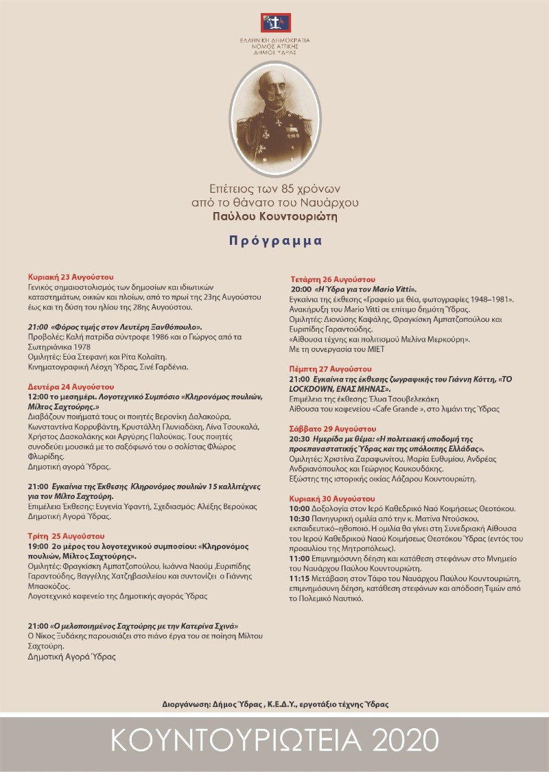 Τιμώντας την 85η επέτειο από τον θάνατο του πρώτου Προέδρου της Ελληνικής Δημοκρατίας, Υδραίου Ναυάρχου Παύλου Κουντουριώτη, ο Δήμος Ύδρας και η Κοινωφελής Επιχείρηση Δήμου Ύδρας πραγματοποιούν τις εορταστικές εκδηλώσεις "Κουντουριώτεια 2020", από τις 23 μέχρι τις 30 Αυγούστου.