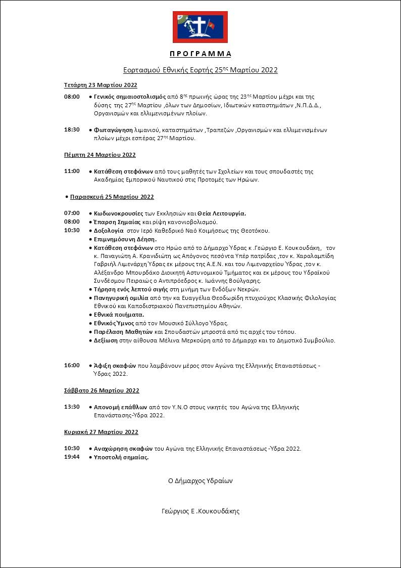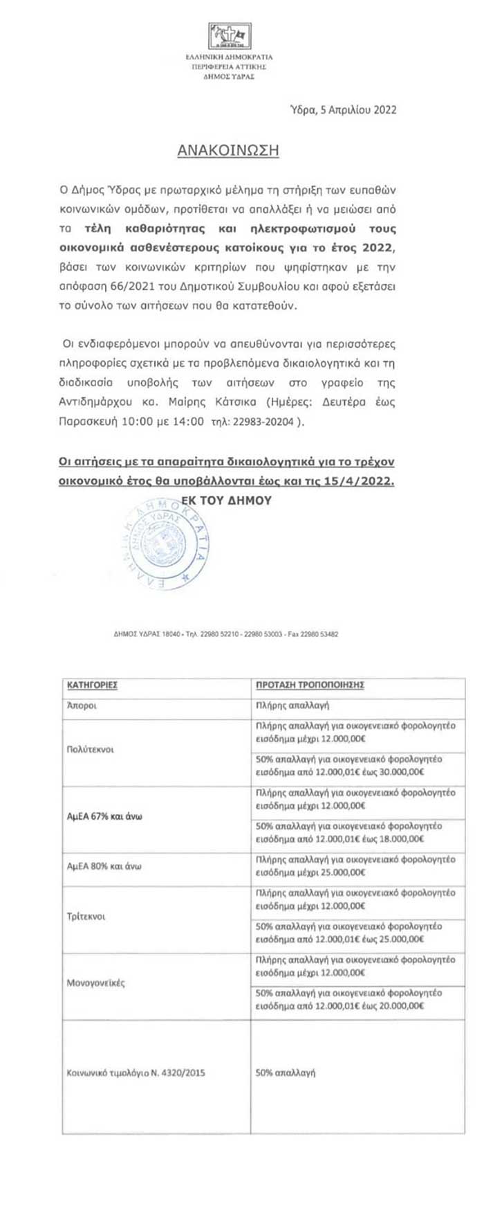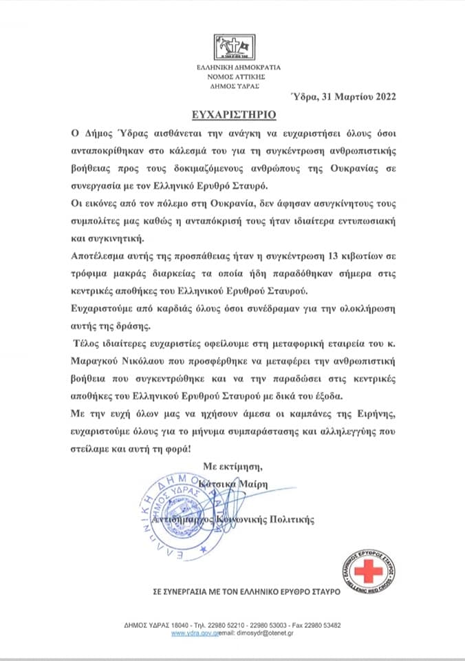 Μείωση και απαλλαγή από Δημοτικά τέλη καθαριότητας και ηλεκτροφωτισμού ευπαθών ομάδων για το έτος 2022 Πρόσληψη δώδεκα (12) ατόμων, με σύμβαση εργασίας ιδιωτικού δικαίου ορισμένου χρόνου για την κάλυψη εποχικών ή παροδικών αναγκών ανταποδοτικού χαρακτήρα του Δήμου Ύδρας Παραδόθηκε στις 31/3/2022 η ανθρωπιστική βοήθεια του Δήμου Ύδρας για τον δοκιμαζόμενο λαό της Ουκρανίας στον Ελληνικό Ερυθρό Σταυρό