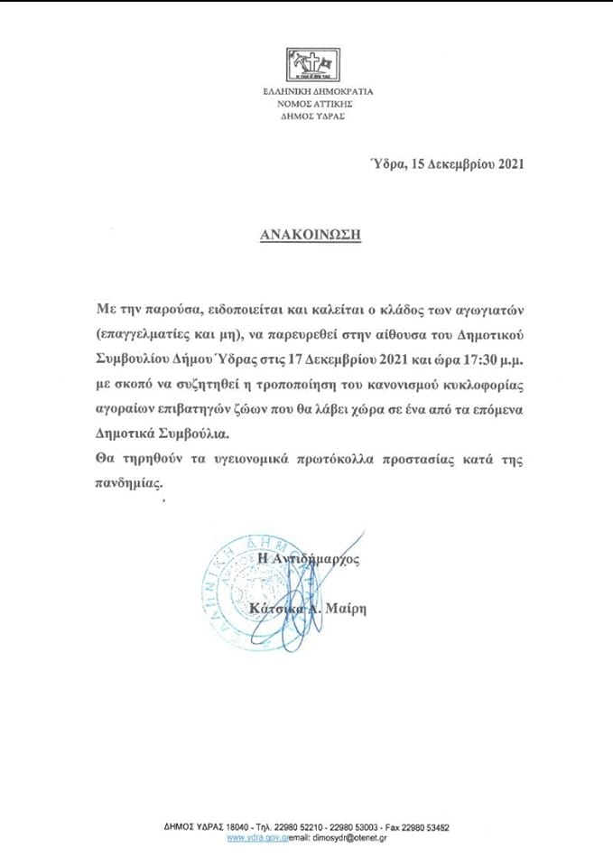 Το αντιπλημμυρικό έργο στο Καμίνι λίγο πριν την ολοκλήρωση του Καλείται ο κλάδος των αγωγιατών να παρευρεθεί στην αίθουσα του Δημοτικού Συμβουλίου στις 17/12/21 και ώρα 17.30 σχετικά με την τροποποίηση του κανονισμού κυκλοφορίας επιβατηγών ζώων Συνάντηση του Δημάρχου Ύδρας κ. Γεωργίου Κουκουδάκη με τον Γενικό Γραμματέα του Υπουργείου Πολιτισμού κ. Γεώργιο Διδασκάλου