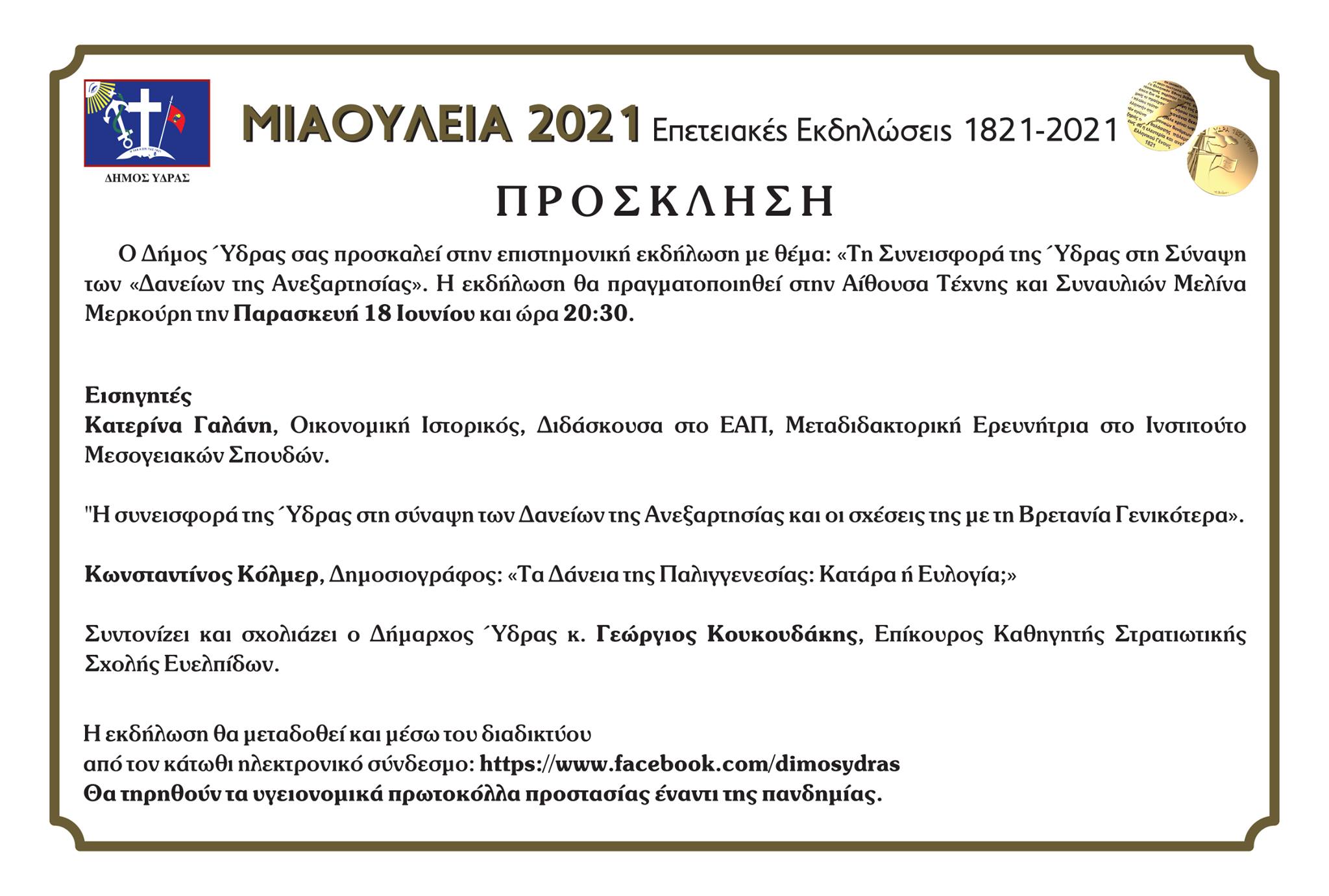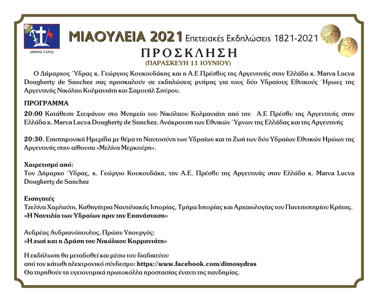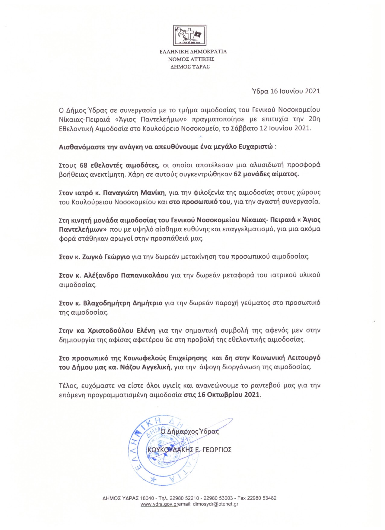 «Mapping the History»: Ένας φωτογραφικός περίπατος αφιερωμένος στην Ύδρα Πρόσληψη δύο (2) ατόμων, με σύμβαση εργασίας ιδιωτικού δικαίου ορισμένου χρόνου για την κάλυψη εποχικών ή παροδικών αναγκών ανταποδοτικού χαρακτήρα του Δήμου ́Υδρας Ο Δήμαρχος Ύδρας κ. Κουκουδάκης έγινε δεκτός από την Α.Ε. Πρόεδρο της Ελληνικής Δημοκρατίας κ. Κατερίνα Σακελαροπούλου για να της επιδώσει την πρόσκληση για τα Μιαούλεια 2021