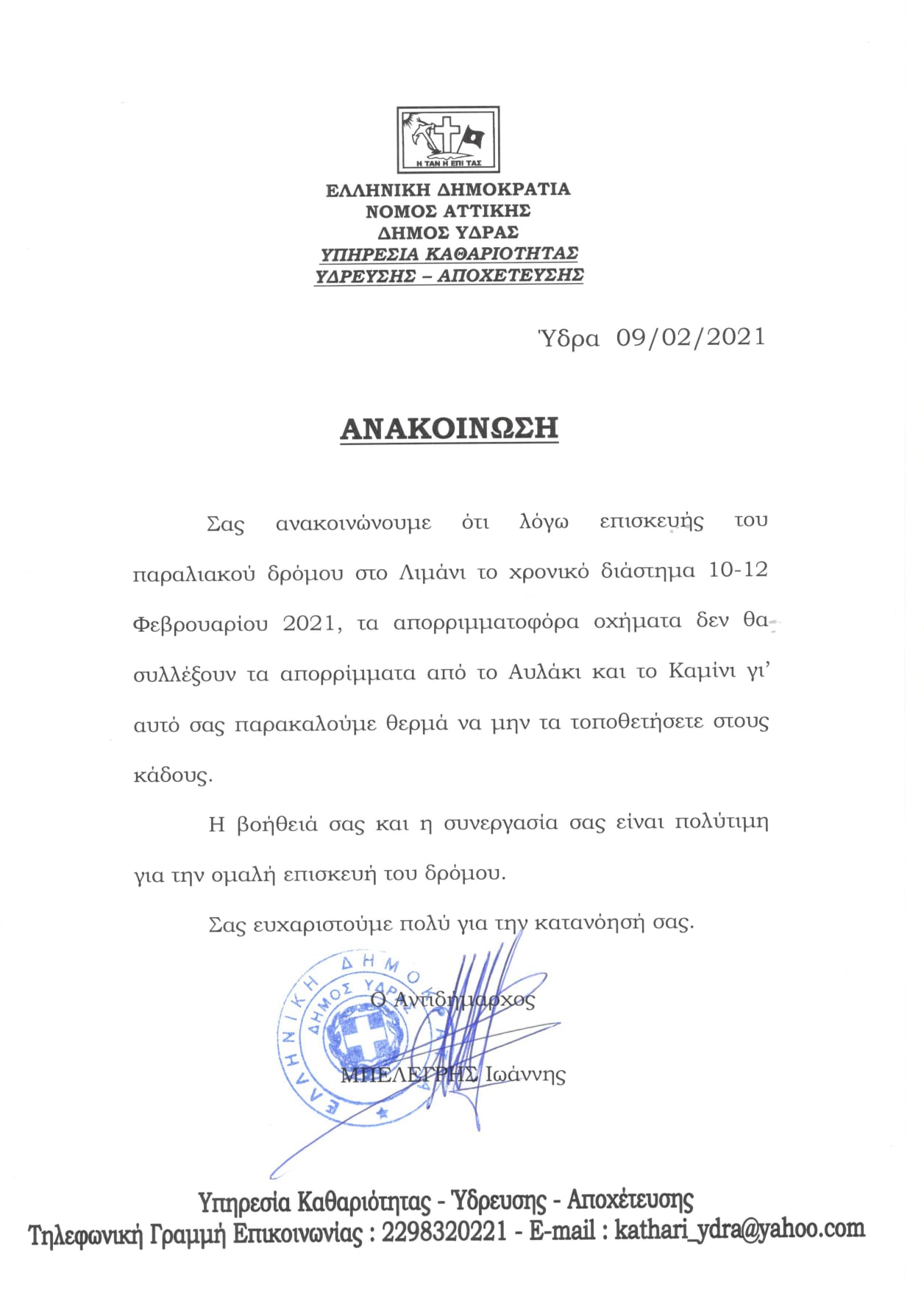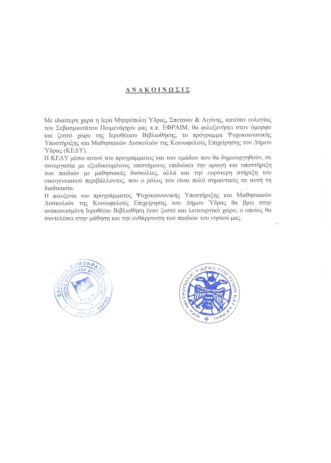 Για δεύτερη συνεχόμενη χρονιά στην Ύδρα μας η διοργάνωση του Συνεδρίου της Διεθνούς Ένωσης Πολιτιστικού και Ψηφιακού Τουρισμού, του Πανεπιστημίου Δυτικής Ελλάδας Ολοκληρώθηκε και το έργο της επισκευής δρόμου 500 μέτρων στην περιοχή "Μανδράκι" και η κατασκευή μικρού αντιπλημμυρικού για την προστασία της μονάδας αφαλάτωσης Το πρόγραμμα Ψυχοκοινωνικής Υποστήριξης και Μαθησιακών Δυσκολιών της Κοινωφελούς Επιχείρησης του Δήμου Ύδρας θα φιλοξενηθεί στην Ιεροθέειο Βιβλιοθήκη