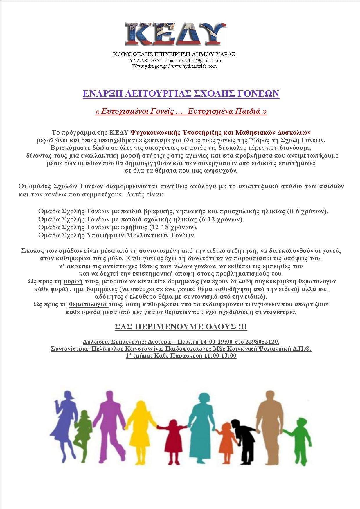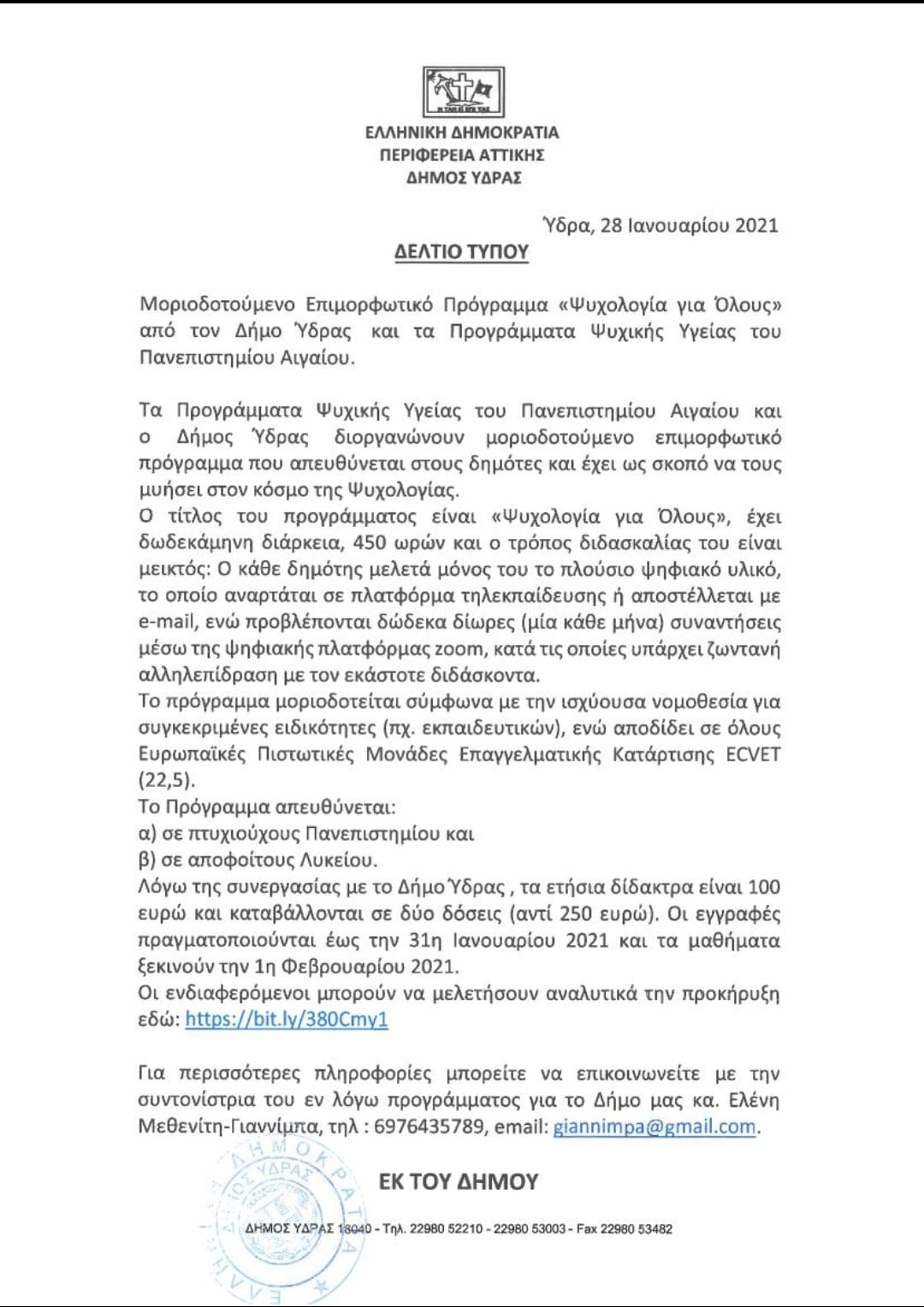 Την Παρασκευή 5/2/2021 δεν θα πραγματοποιηθεί αποκομιδή των απορριμμάτων από τα απορριμματοφόρα από τις περιοχές Καμίνι και Αυλάκι Πρόσκληση 3ης τακτικής Συνεδρίασης του Δημοτικού Συμβουλίου Πανελλήνιος Διαγωνισμός Ζωγραφικής για μαθητές και μαθήτριες Ε' και Στ' Δημοτικού με θέμα: «Ο Ήρωάς μου, η Ηρωίδα μου», για να τιμήσει η Ύδρα τα 200 χρόνια ύπαρξης του νεότερου Ελληνικού Κράτους και τη συμμετοχή της στον Αγώνα