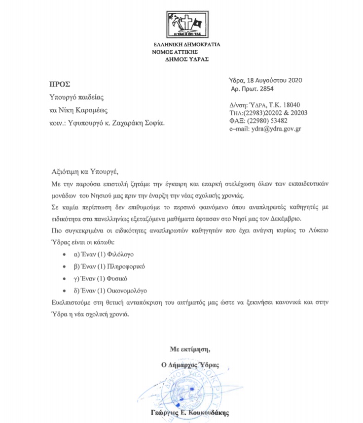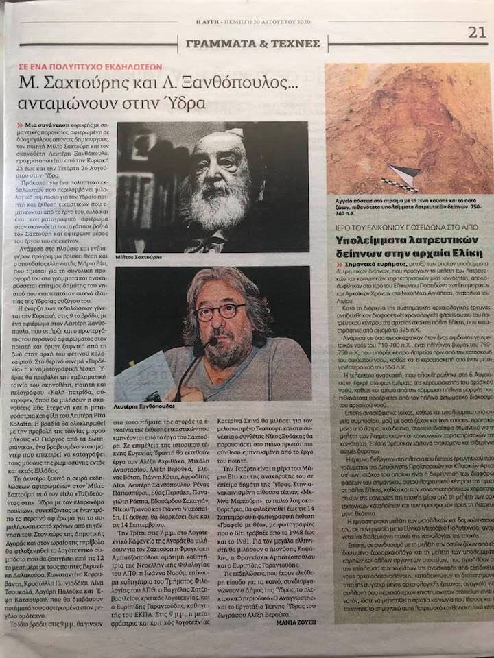 Σε ένα πολύπτυχο εκδηλώσεων Μ. Σαχτούρης και Λ. Ξανθόπουλος... ανταμώνουν στην Ύδρα Επιστολή Δημάρχου Ύδρας στην Υπουργό Παιδείας για την έγκαιρη στελέχωση των εκπαιδευτικών μονάδων του νησιού Η προσπάθεια του Δήμου μας για την σταδιακή κατάργηση της πλαστικής τσάντας και της ταυτόχρονης ενίσχυσης του Κοινωνικού του Παντοπωλείου συνεχίζεται