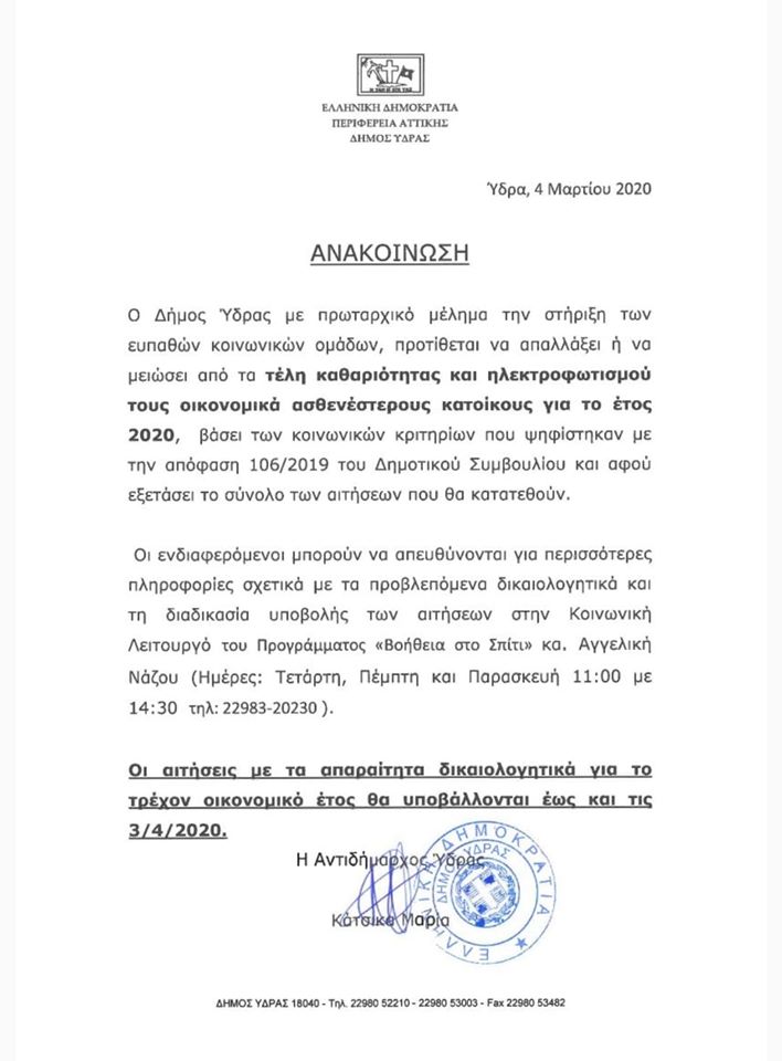 Κύριε Δήμαρχε, Κύρια & Κύριε Σύμβουλε, Καλείστε όπως την 9η Μαρτίου 2020, ημέρα Δευτέρα και ώρα 17.30 προσέλθετε σε τακτική συνεδρίαση του Δημοτικού Συμβουλίου στην αίθουσα Συνεδριάσεων του Δήμου Ύδρας