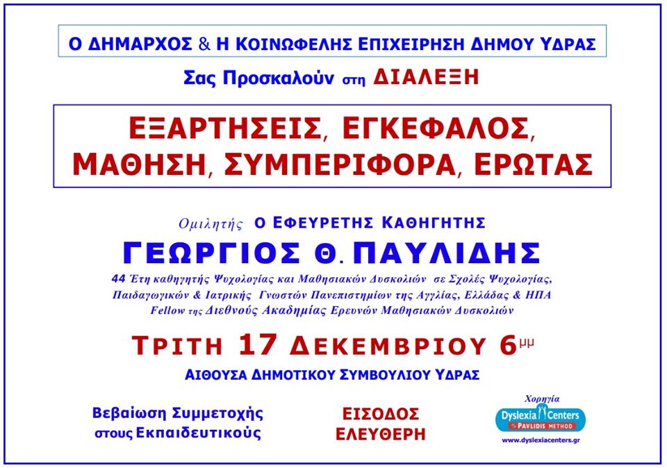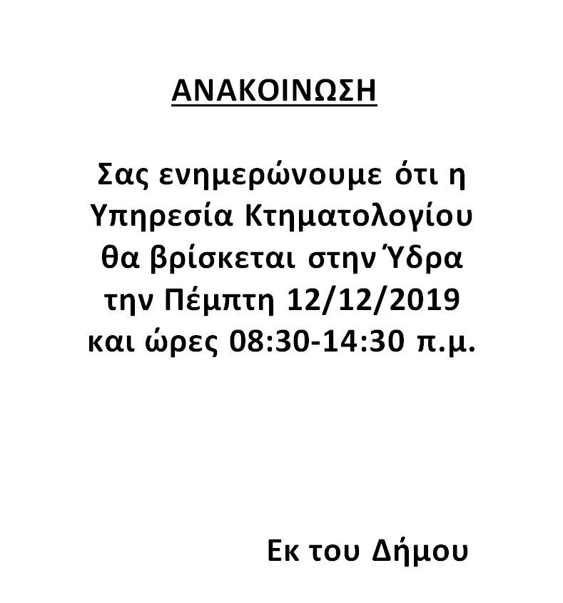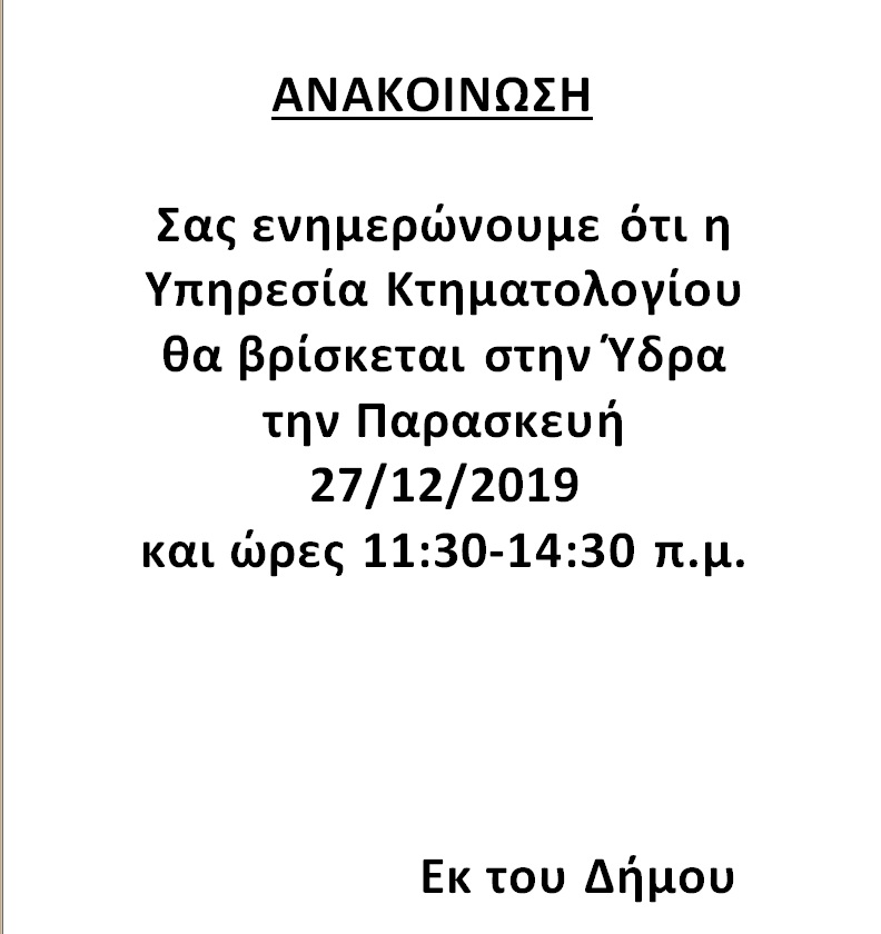Πρόσκληση τακτικής Συνεδρίασης του Δημοτικού Συμβουλίου Ο Δήμαρχος και το Κ.Ε.Δ.Υ σας προσκαλούν στη διάλεξη «Εξαρτήσεις, Εγκέφαλος, Μάθηση, Συμπεριφορά, Έρωτας» την Τρίτη 17 Δεκεμβρίου στις 18.00, στην αίθουσα Δημοτικού Συμβουλίου Ύδρας Η υπηρεσία κτηματολογίου θα βρίσκεται στην Ύδρα την Παρασκευή 27 Δεκεμβρίου 2019 και ώρες 11.30-14.30 π.μ.