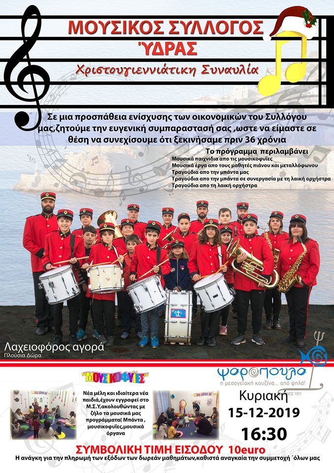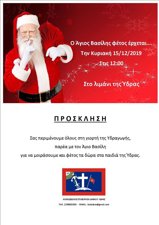 Κύριε Δήμαρχε, Κύρια & Κύριε Σύμβουλε, Καλείστε όπως την 18η Δεκεμβρίου 2019, ημέρα Τετάρτη και ώρα 17.00 προσέλθετε σε τακτική συνεδρίαση του Δημοτικού Συμβουλίου στην αίθουσα Συνεδριάσεων του Δήμου Ύδρας