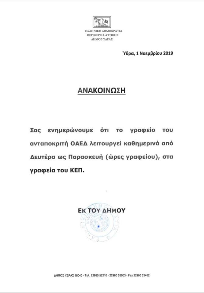 Κύριε Δήμαρχε, Κύρια & Κύριε Σύμβουλε, Καλείστε όπως την 12η Νοεμβρίου 2019, ημέρα Τρίτη και ώρα 17.00 προσέλθετε σε τακτική συνεδρίαση του Δημοτικού Συμβουλίου στην αίθουσα Συνεδριάσεων του Δήμου Ύδρας