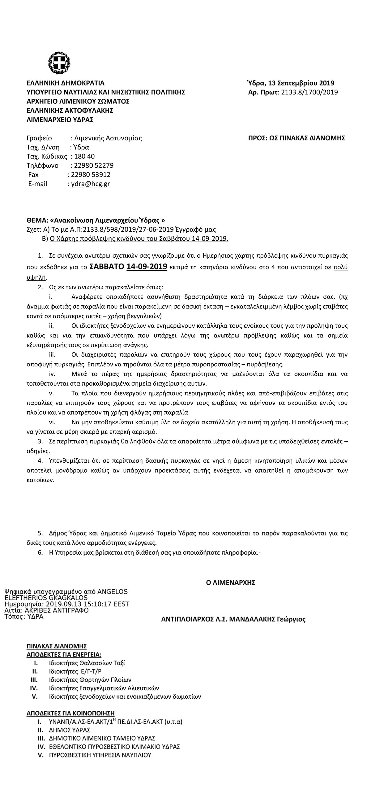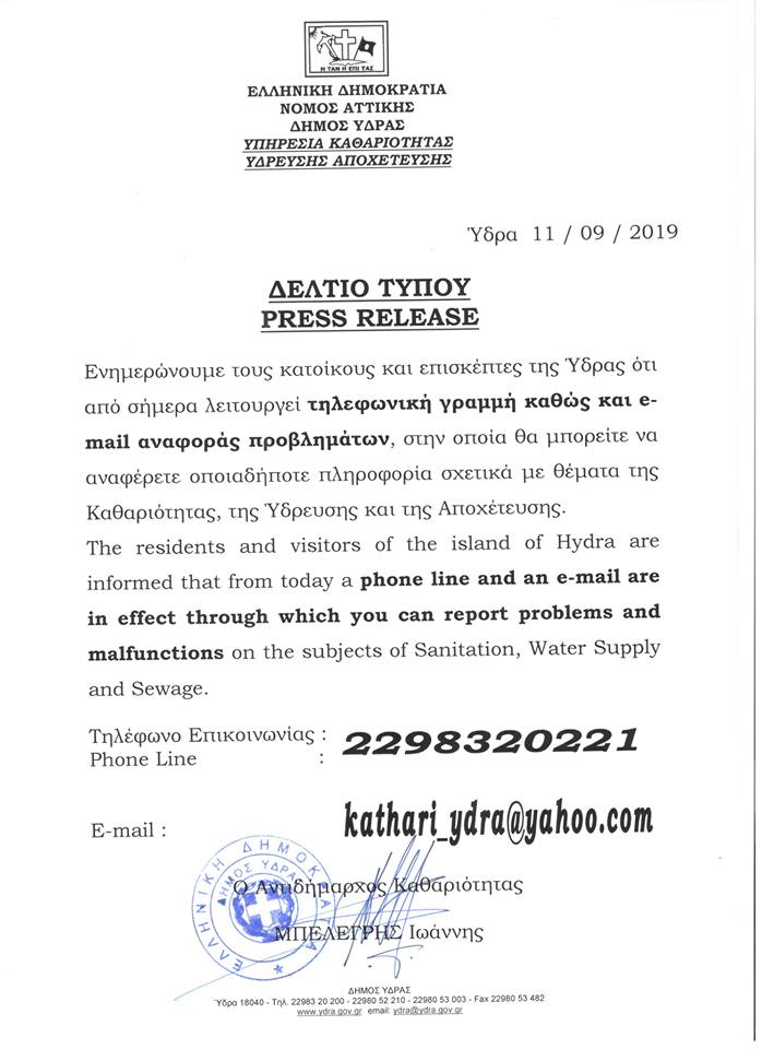 Κύριε Δήμαρχε, Κύρια & Κύριε Σύμβουλε, Καλείστε όπως την 23η Σεπτεμβρίου 2019, ημέρα Δευτέρα και ώρα 11.00 προσέλθετε σε έκτακτη συνεδρίαση του Δημοτικού Συμβουλίου στην αίθουσα Συνεδριάσεων του Δήμου Ύδρας