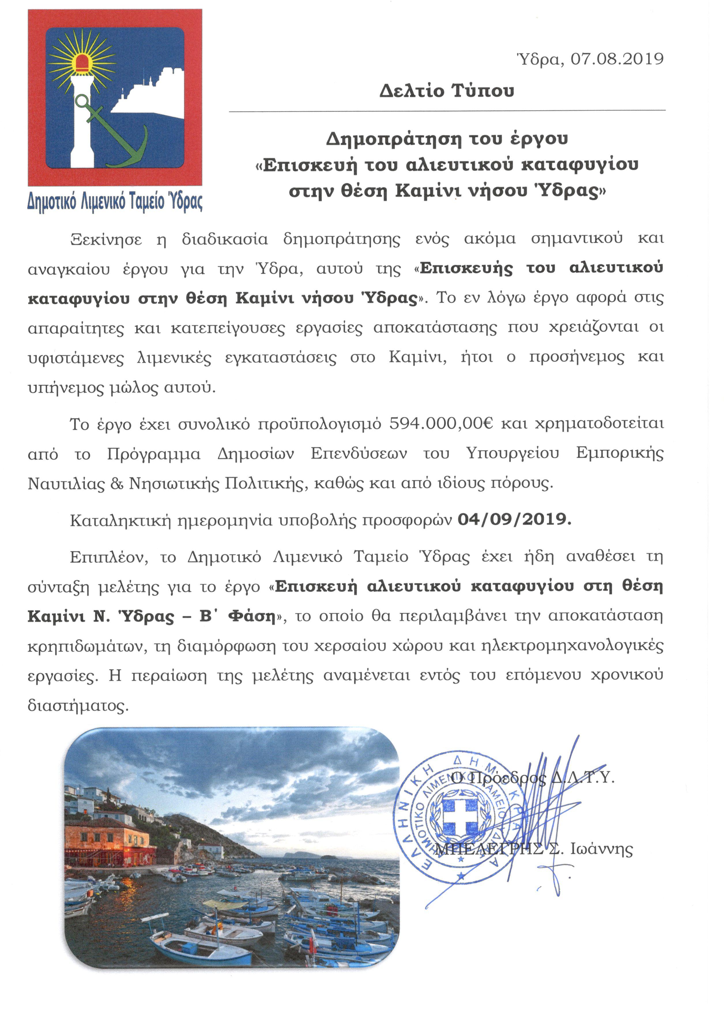 Δελτίο Τύπου - Δημοπράτηση του Έργου "Επισκευή Αλιευτικού Καταφυγίου στην θέση Καμίνι νήσου Ύδρας"