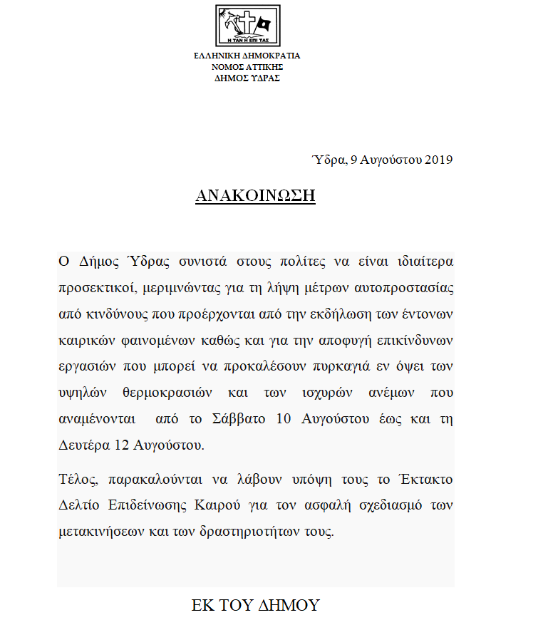 Ανακοίνωση Λιμεναρχείου Ύδρας σχετικά με εκδήλωση πυρκαγιάς Χάρτης Πρόβλεψης Κινδύνου Πυρκαγιάς Ανακοίνωση για έντονα καιρικά φαινόμενα