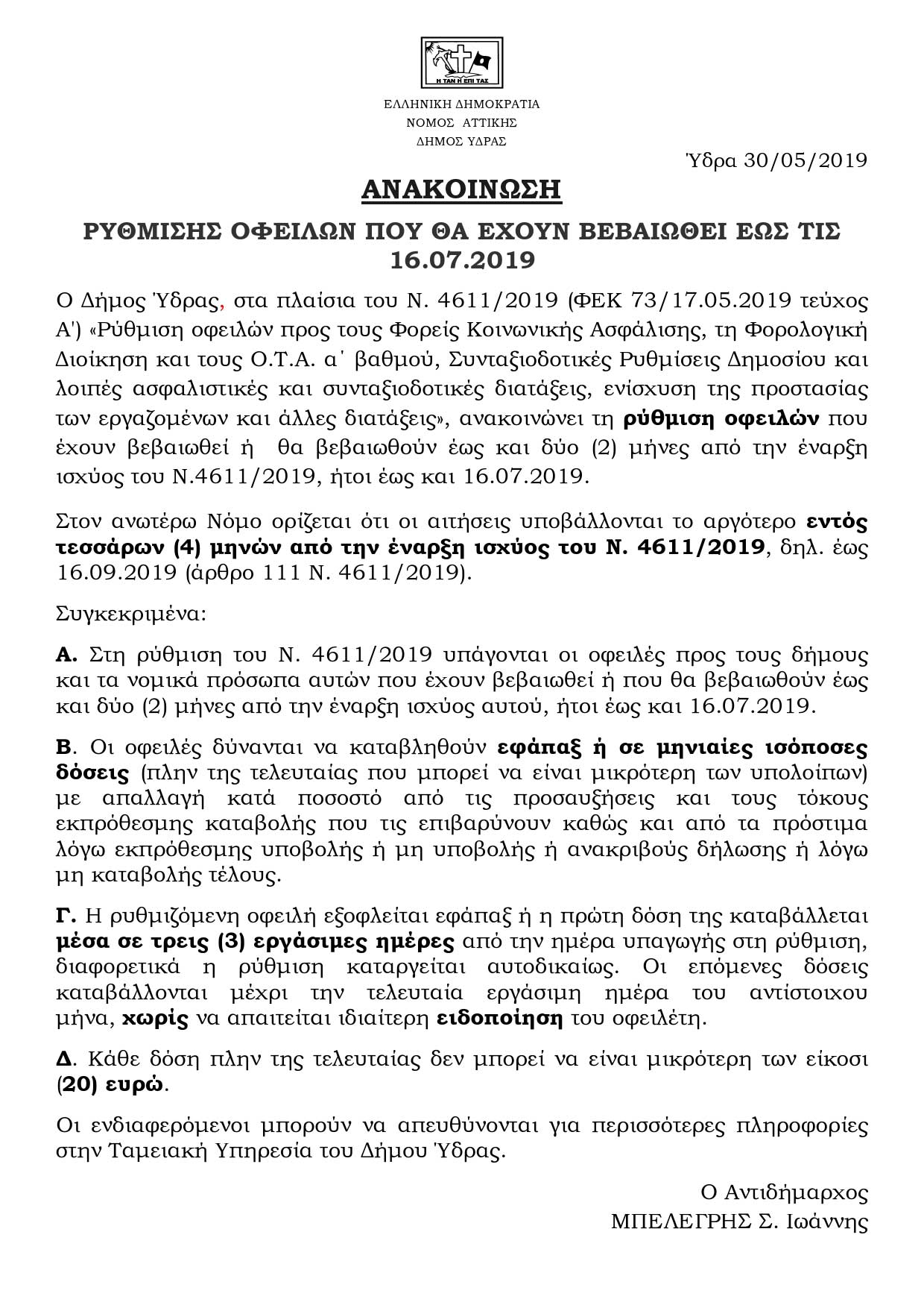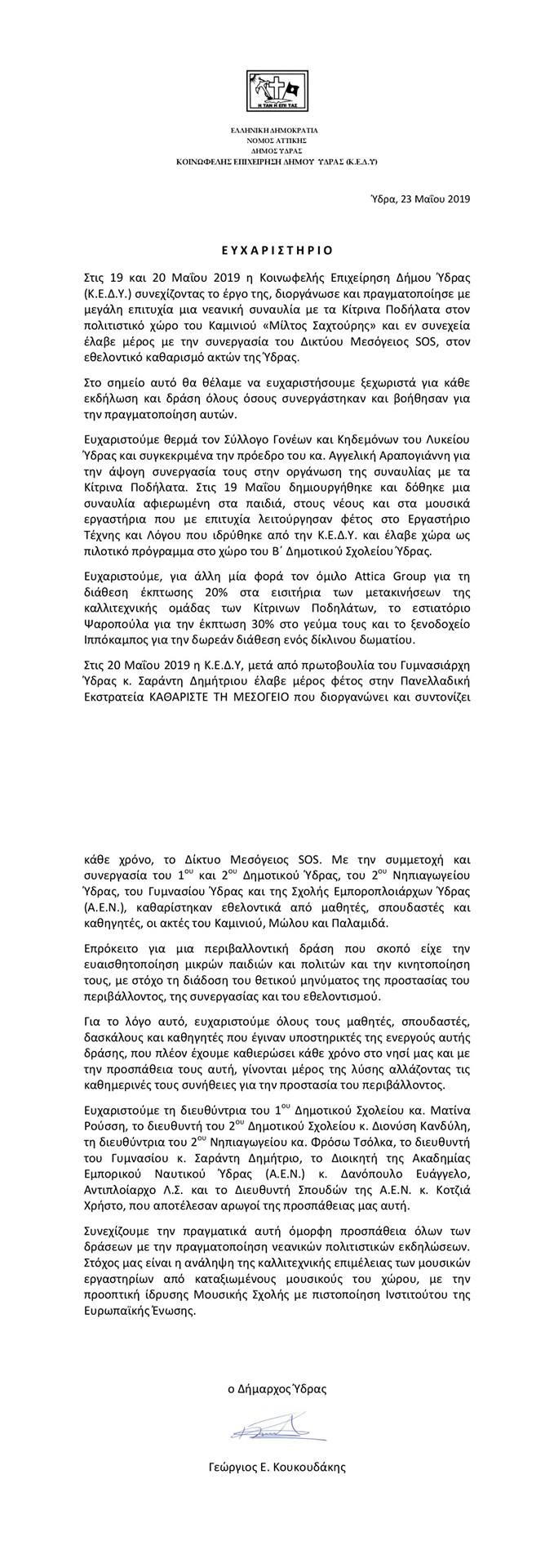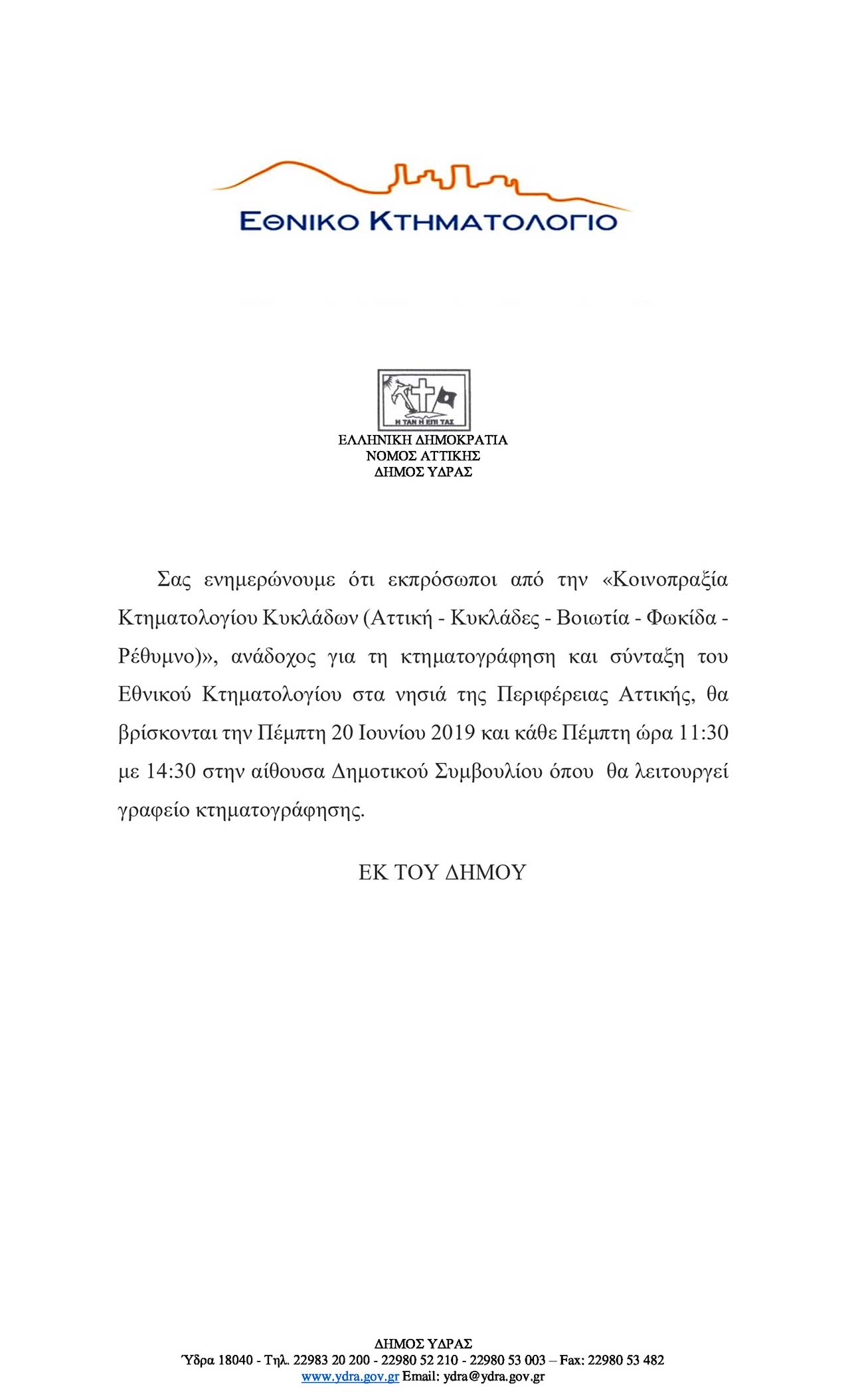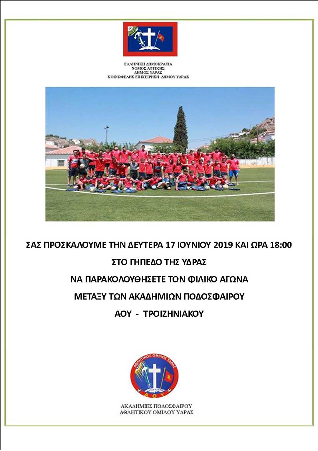 Λειτουργία γραφείου κτηματογράφησης από την Πέμπτη 20 Ιουνίου 2019 και κάθε Πέμπτη Διεξήχθη ο φιλικός αγώνας μεταξύ των Ακαδημιών Α.Ο. Ύδρας και Τροιζηνιακού στα πλαίσια των εορτασμών των Μιαουλείων 2019 Ευχαριστούμε την συμπατριώτισσα μας Καλλιόπη Σαϊτη για την όμορφη θεατρική παράσταση για παιδιά που παρακολουθήσαμε στο λιμάνι της Ύδρας μας στις 16 Ιουνίου 2019