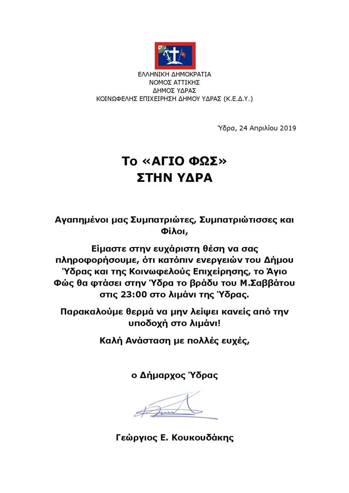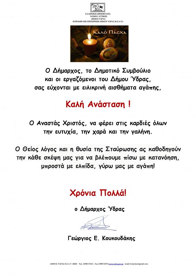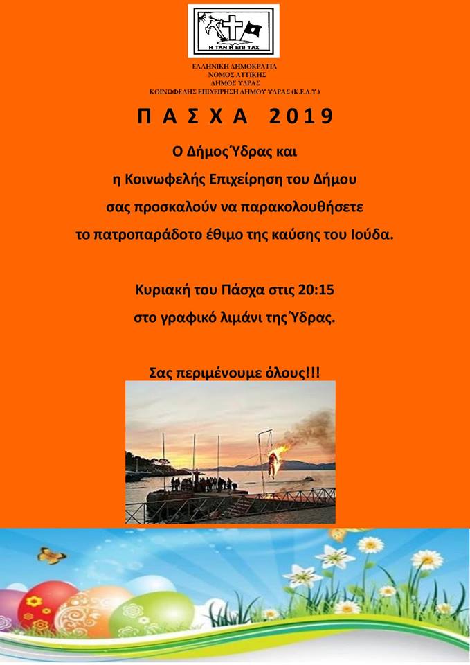 Ένα από τα πιο όμορφα θρησκευτικά έθιμα της Ύδρας αλλά και όλης της Ελλάδας, είναι ο Επιτάφιος της ενοριακής εκκλησίας του Τιμίου Προδρόμου Ο Δήμαρχος, το Δημοτικό Συμβούλιο και οι εργαζόμενοι του Δήμου Ύδρας σας εύχονται με ειλικρινή αισθήματα αγάπης, Καλή Ανάσταση! Πρόσκληση για το πατροπαράδοτο έθιμο της καύσης του Ιούδα την Κυριακή του Πάσχα στις 20.15 στο γραφικό λιμάνι της Ύδρας
