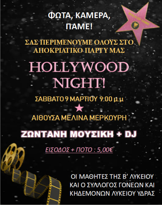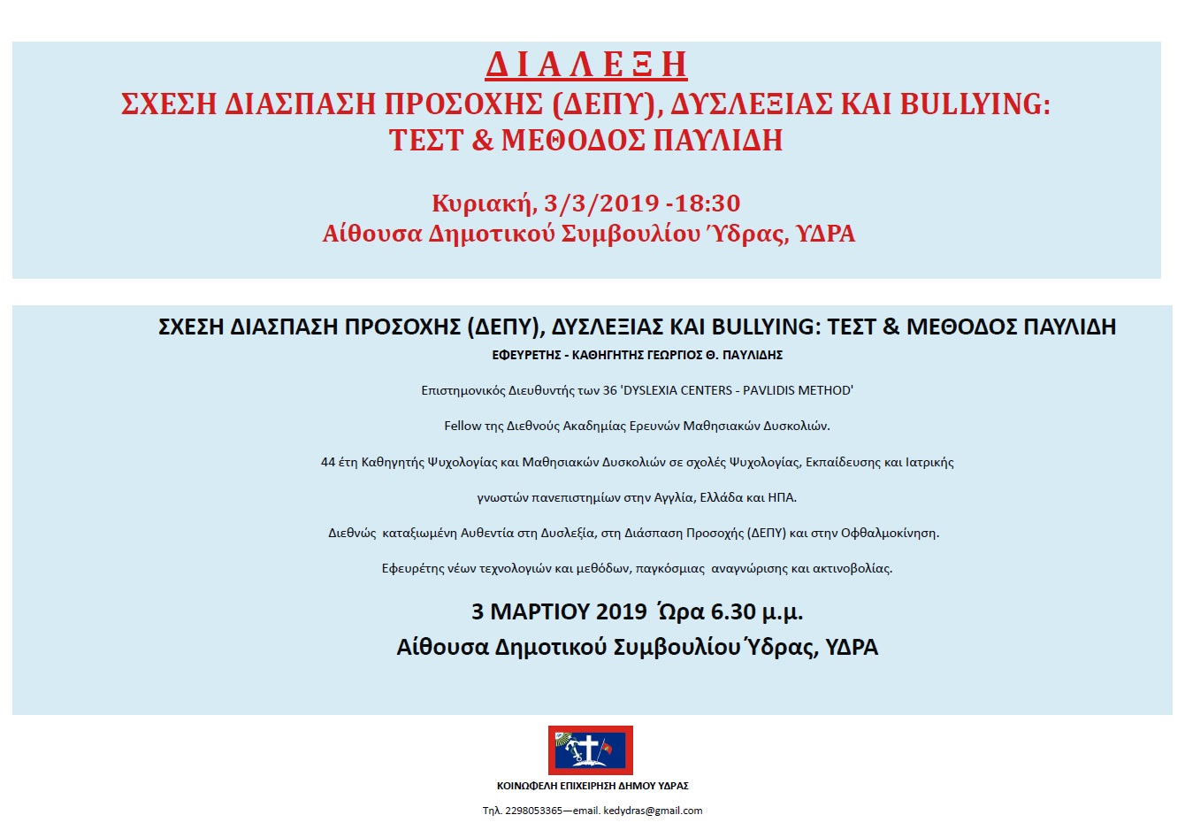 Διάλεξη την Κυριακή 3/3/2019 στην αίθουσα Δημοτικού Συμβουλίου Ύδρας σχετικά με τη σχέση διάσπασης προσοχής, δυσλεξίας και bullying Αποκριάτικο πάρτυ "Hollywood night" το Σάββατο 9 Μαρτίου και ώρα 9.00 μ.μ., με ζωντανή μουσική και DJ στην αίθουσα "Μελίνα Μερκούρη" Στη διεθνή τουριστική έκθεση "New York Times Travel Show", επισκέφθηκε το περίπτερο του Δήμου μας και η νικήτρια του διαγωνισμού ομορφιάς των νησιών Curacao της Καραϊβικής