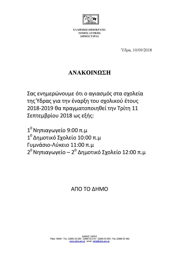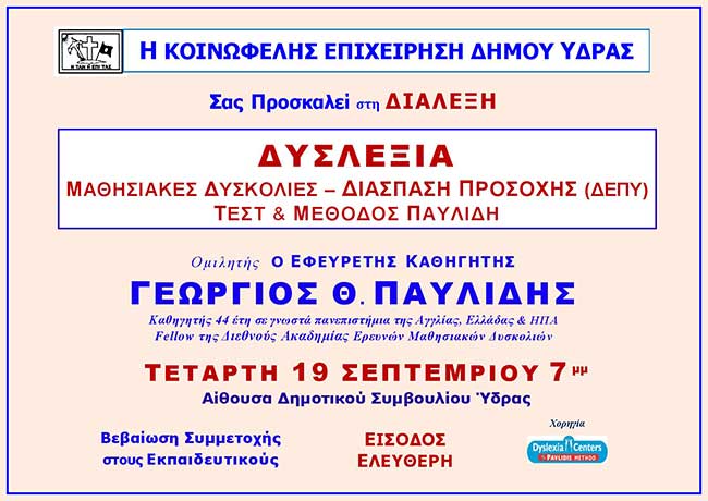 Ανοικτή διαδικασία για την επιλογή αναδόχου κατασκευής του έργου "Υδρευση Παλαμιδάς-Βλυχός νήσου Υδρας" 9ο Ναυτιλιακό Συνέδριο Ύδρας το Σάββατο 15 Σεπτεμβρίου 2018 Διάλεξη με θέμα τη Δυσλεξία την Τετάρτη 19 Σεπτεμβρίου 2018