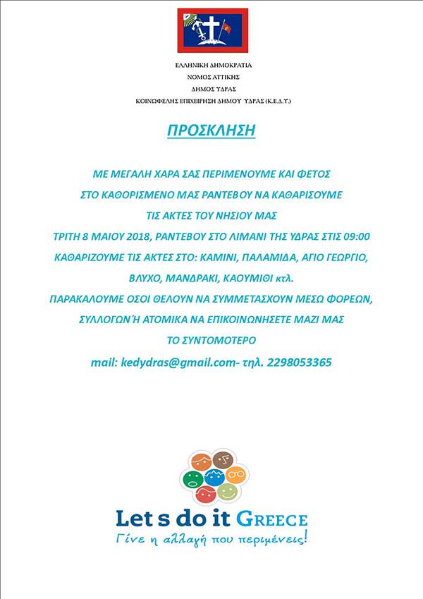 Κύριε Δήμαρχε, Κύρια & Κύριε Σύμβουλε, Καλείστε όπως την 10η Μαΐου 2018, ημέρα Πέμπτη και ώρα 18.00 προσέλθετε σε τακτική συνεδρίαση του Δημοτικού Συμβουλίου στην αίθουσα Συνεδριάσεων του Δήμου Ύδρας