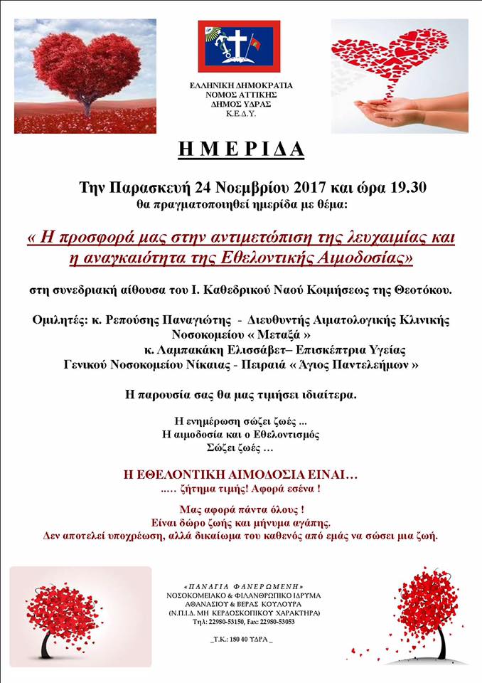 Κύριε Δήμαρχε, Κύρια & Κύριε Σύμβουλε, Καλείστε όπως την 28η Νοεμβρίου 2017, ημέρα Τρίτη και ώρα 18:00 προσέλθετε σε Τακτική συνεδρίαση του Δημοτικού Συμβουλίου στην αίθουσα Συνεδριάσεων του Δήμου Ύδρας