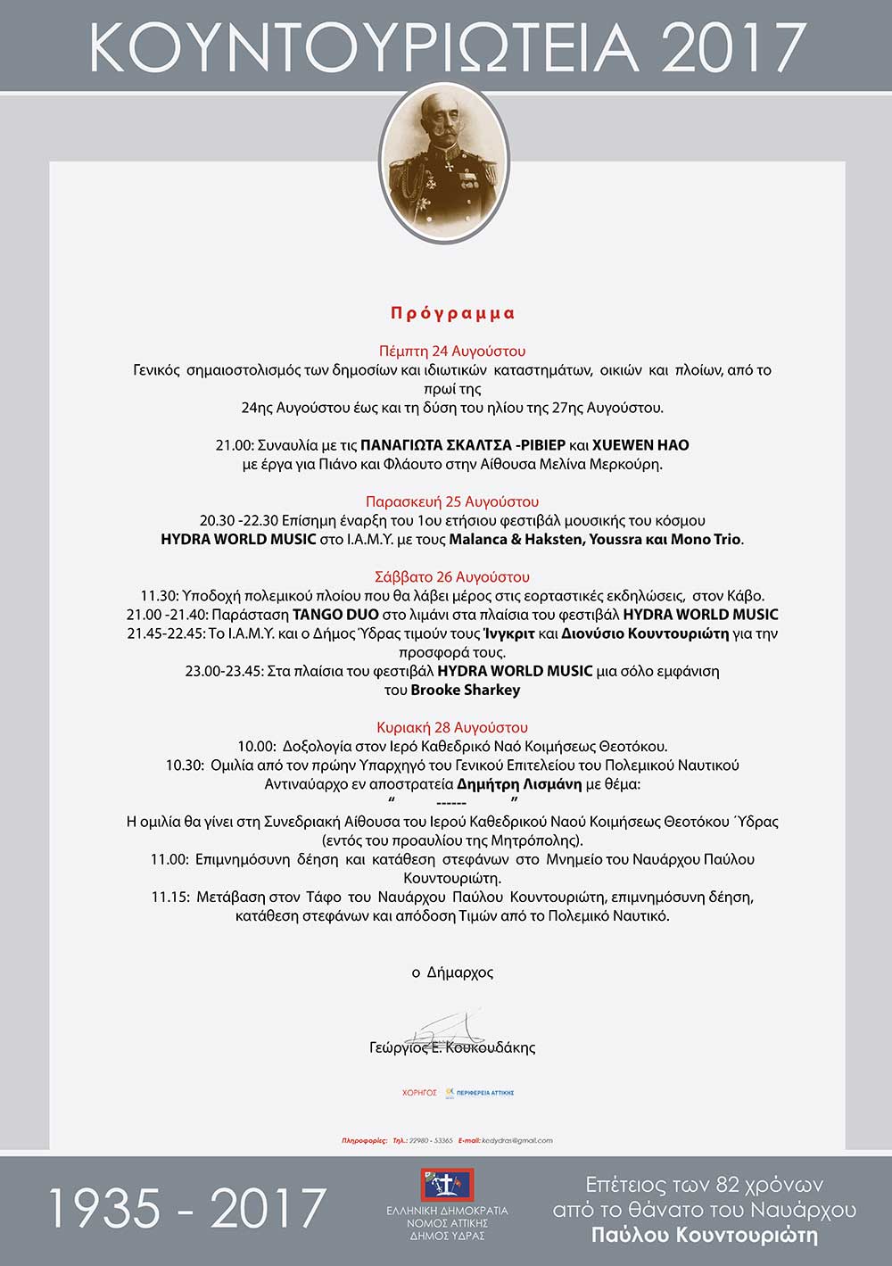 Σύσκεψη για τη διαχείριση απορριμμάτων με τον Υπουργό Ναυτιλίας και Νησιωτικής Πολιτικής Π. Κουρουμπλή Αίτημα προσλήψεων τακτικού προσωπικού του Δήμου Ύδρας Με τα εγκαίνια του χώρου πολιτιστικών εκδηλώσεων και νησιώτικο γλέντι στα Καμίνια ολοκληρώθηκαν με μεγάλη επιτυχία τα «Κουντουριώτεια 2017»