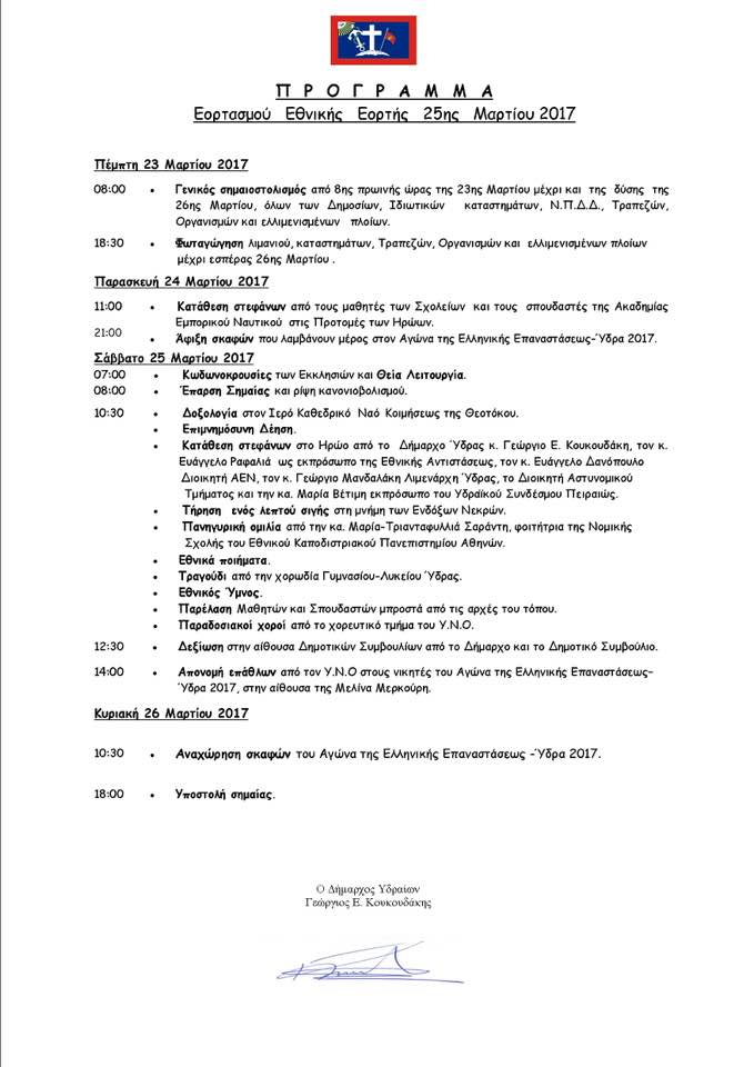 Κύριε Δήμαρχε, Κύρια & Κύριε Σύμβουλε, Καλείστε όπως την 28η Μαρτίου 2017, ημέρα Τρίτη και ώρα 18.00 προσέλθετε σε τακτική συνεδρίαση του Δημοτικού Συμβουλίου στην αίθουσα Συνεδριάσεων του Δήμου Ύδρας