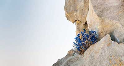 D'étranges fleurs bleues, symboles d'utopie, ont envahi les rochers d'Hydra depuis juillet dernier : « The Blue as The New Green » est l'oeuvre de Maria Tsagkari. - Kostas Pappas