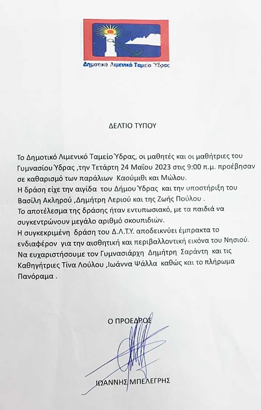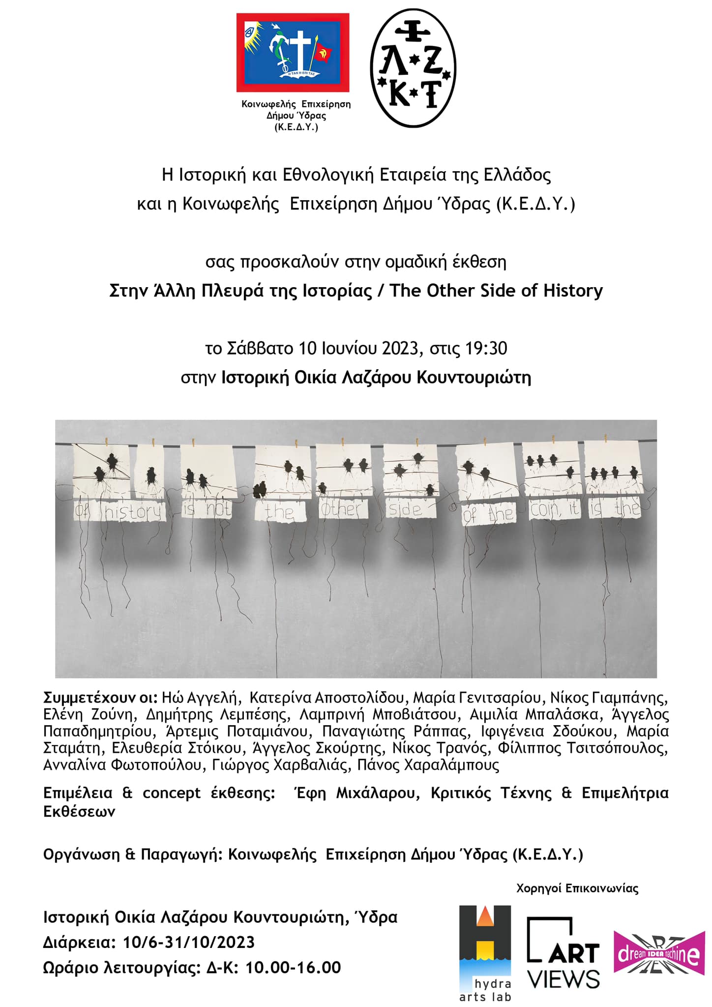 Φεστιβάλ Θεάτρου «Hydrama 2023» Ολοκληρώθηκε και το έργο της κατασκευής του δρόμου περιμετρικά από το νεκροταφείο της Αγίας Φωτεινής Πρόσκληση σε ομαδική έκθεση με τίτλο <<Στην Άλλη Πλευρά της Ιστορίας>>, το Σάββατο 10 Ιουνίου 2023 και ώρα 19.30 στην Ιστορική Οικία του Λαζάρου Κουντουριώτη