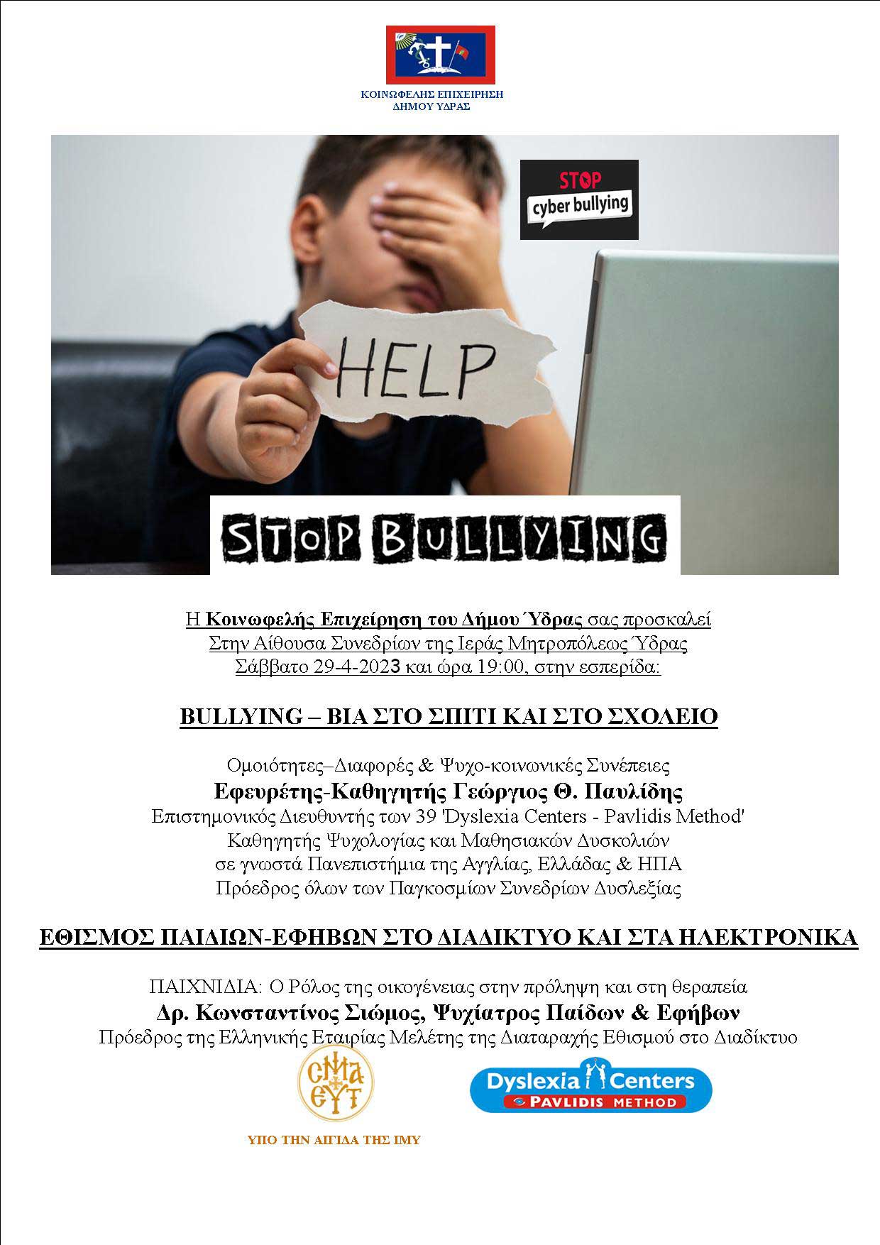 Ανακοίνωση ΣΟΧ6/2023 ΕΠΕΚΑ για σύμβαση Ορισμένου Χρόνου στο Κοινωνικό Παντοπωλείο και Κοινωνικό Φαρμακείο Δήμου Ύδρας Από την πανέμορφη και ανοιξιάτικη Ύδρα μας Χρόνια Πολλά τον Μάη Η Κοινωφελής Επιχείρηση του Δήμου Ύδρας σας προσκαλεί στην Αίθουσα Συνεδρίων της Ιεράς Μητροπόλεως Ύδρας, στις 29/04/2023 και ώρα 19.00, στην εσπερίδα «Bulling - Βία στο σπίτι και στο Σχολείο»