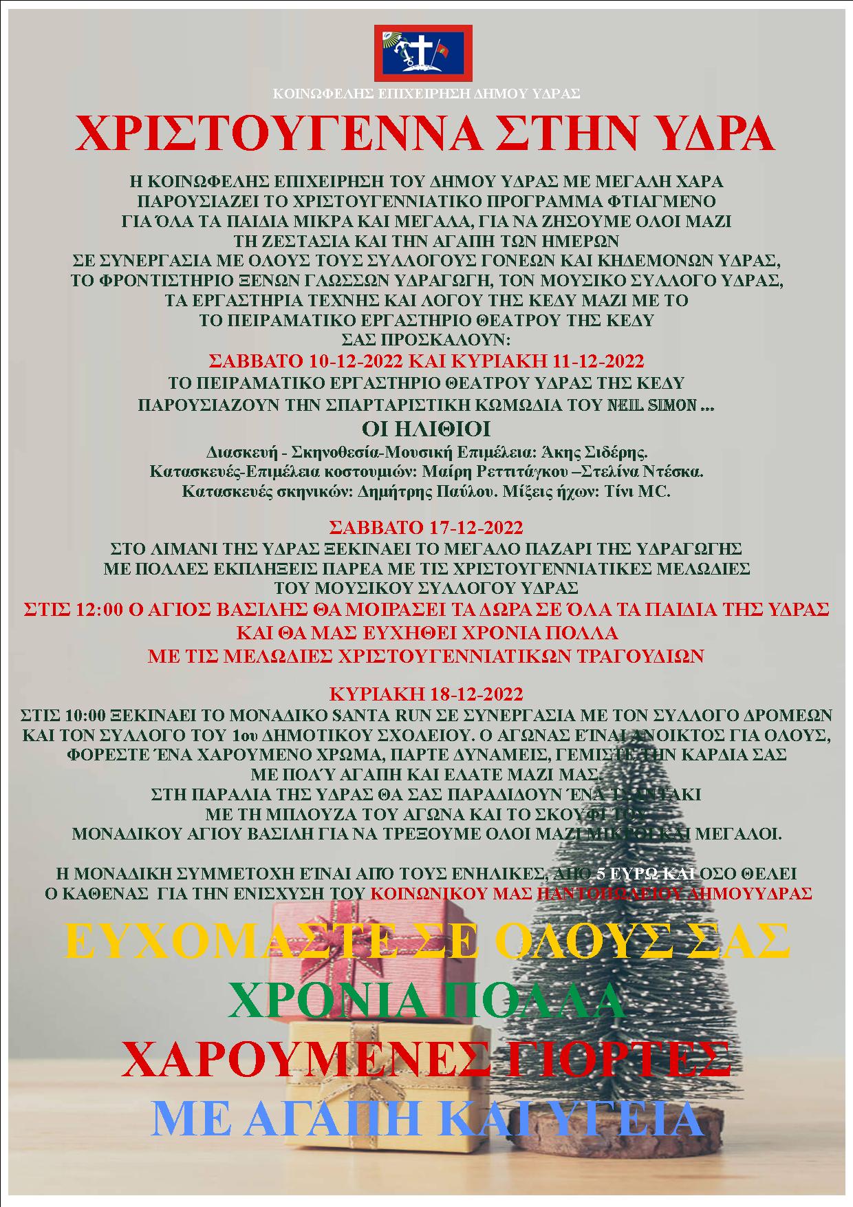 Κύριε Δήμαρχε, Κύρια & Κύριε Σύμβουλε, Καλείστε όπως την 14η Δεκεμβρίου 2022, ημέρα Τετάρτη και ώρα 19.00 προσέλθετε σε τακτική συνεδρίαση του Δημοτικού Συμβουλίου στην αίθουσα Συνεδριάσεων του Δήμου Ύδρας