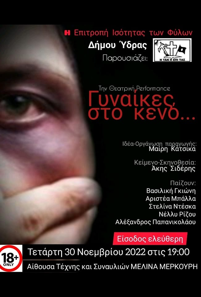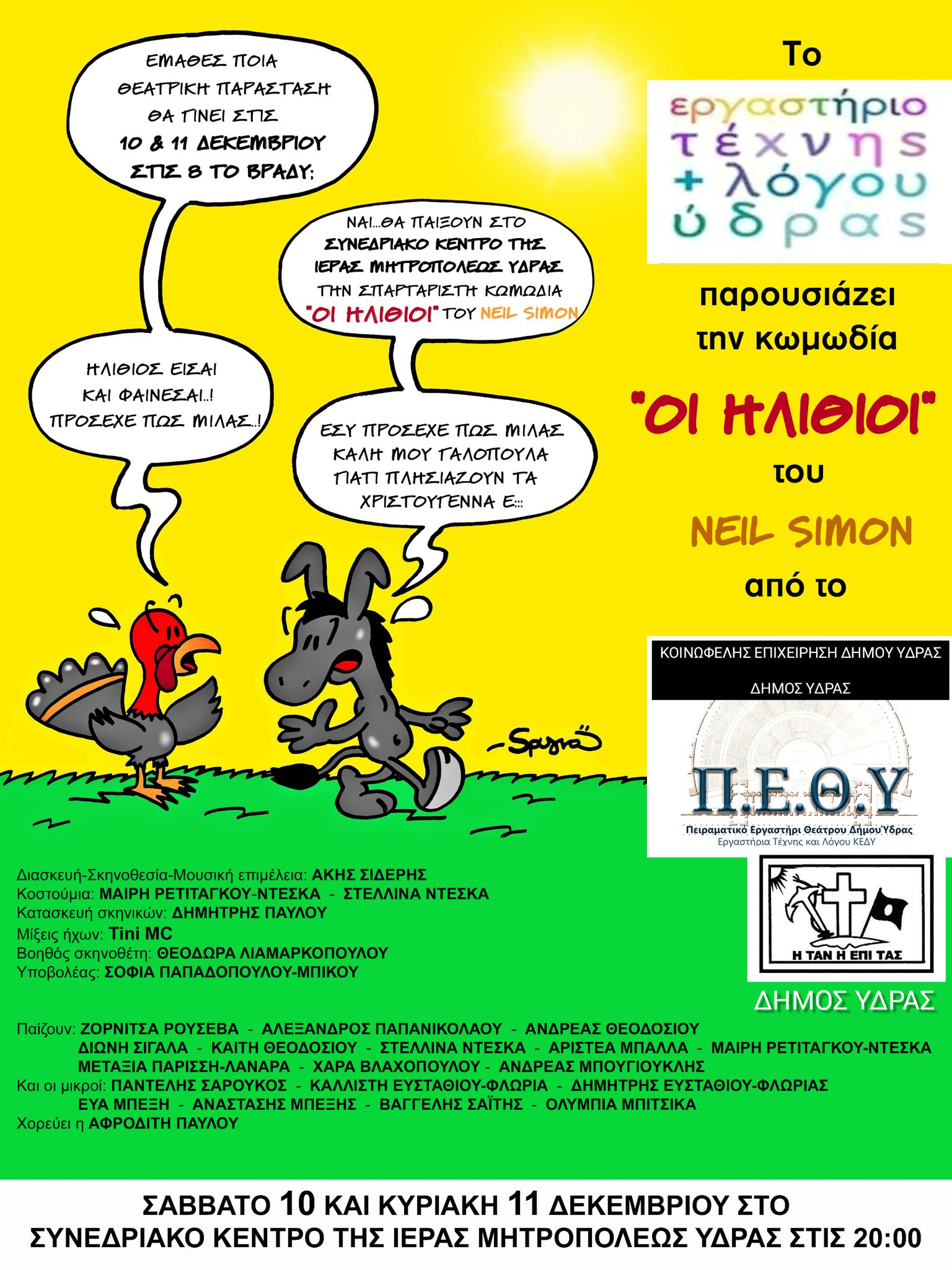 Το Εργαστήριο Τέχνης Και Λόγου της ΚΕΔΥ παρουσιάζει την κωμωδία «ΟΙ ΗΛΙΘΙΟΙ» του Neil Simon, στις 10 & 11 Δεκεμβρίου 2022 στο Συνεδριακό κέντρο της Ιεράς Μητροπόλεως Ύδρας Τελικός πίνακας κατάταξης των υποψηφίων της προκήρυξης ΣΟΧ4/2022 Με μεγάλη επιτυχία πραγματοποιήθηκε η θεατρική παράσταση «Γυναίκες στο Κενό» που διοργάνωσε η Επιτροπή Ισότητας των Φύλων του Δήμου Ύδρας