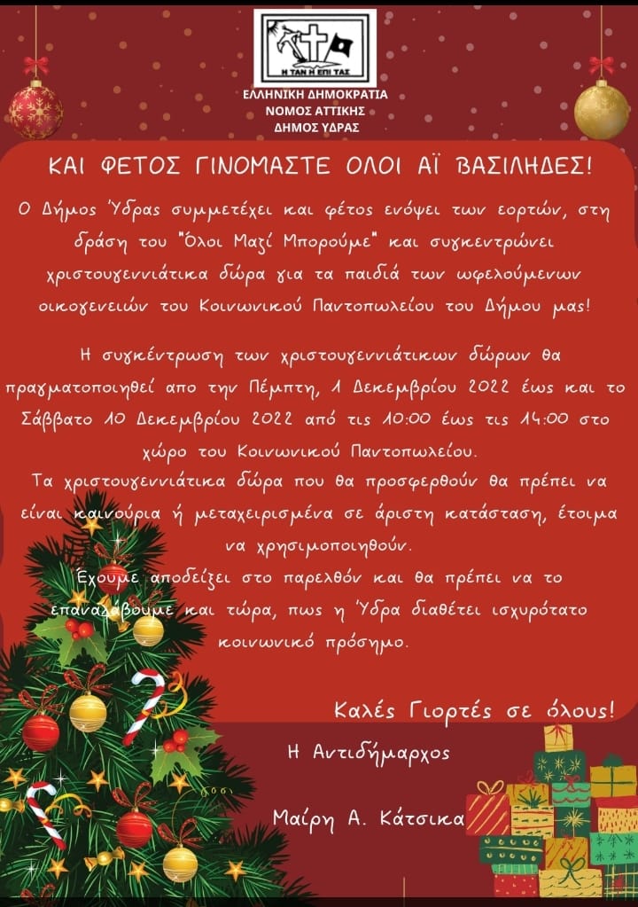 Κύριε Δήμαρχε, Κύρια & Κύριε Σύμβουλε, Καλείστε όπως την 7η Δεκεμβρίου 2022, ημέρα Τετάρτη και ώρα 19.00 προσέλθετε σε τακτική συνεδρίαση του Δημοτικού Συμβουλίου στην αίθουσα Συνεδριάσεων του Δήμου Ύδρας