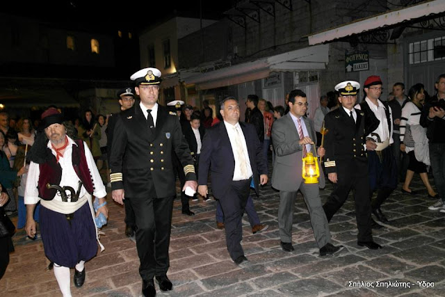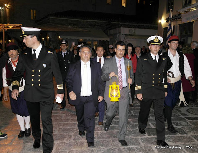 Στην υποδοχή του Αγίου Φωτός στο λιμάνι του νησιού - πού ήρθε με το πλωτό του Λιμεναρχείου Ύδρας, το συνόδευαν τιμητικά Λιμενικοί, αστυνομικός του Α.Τ Ύδρας και δύο άτομα ντυμένοι παραδοσιακά Υδραίοι Μπουρλοτιέρηδες -  παρευρέθηκαν ο Δήμαρχος Ύδρας κ. Γ. Κουκουδάκης, δημοτικοί σύμβουλοι, ο Διοικητής της Ακαδημίας Εμπορικού Ναυτικού Ύδρας Αντιπλοίαρχος ΛΣ κ. Ε. Δανόπουλος, ο Λιμενάρχης Ύδρας Πλωτάρχης  ΛΣ κ. Γ. Μανδαλάκης με τους αξιωματικούς και υπαξιωματικούς του Λιμεναρχείου, ο Υποδιοικητής του Α.Τ..Ύδρας Υπαστυνόμος Β’ κ. Δ. Γιανακάκος, και δεκάδες κόσμου.
