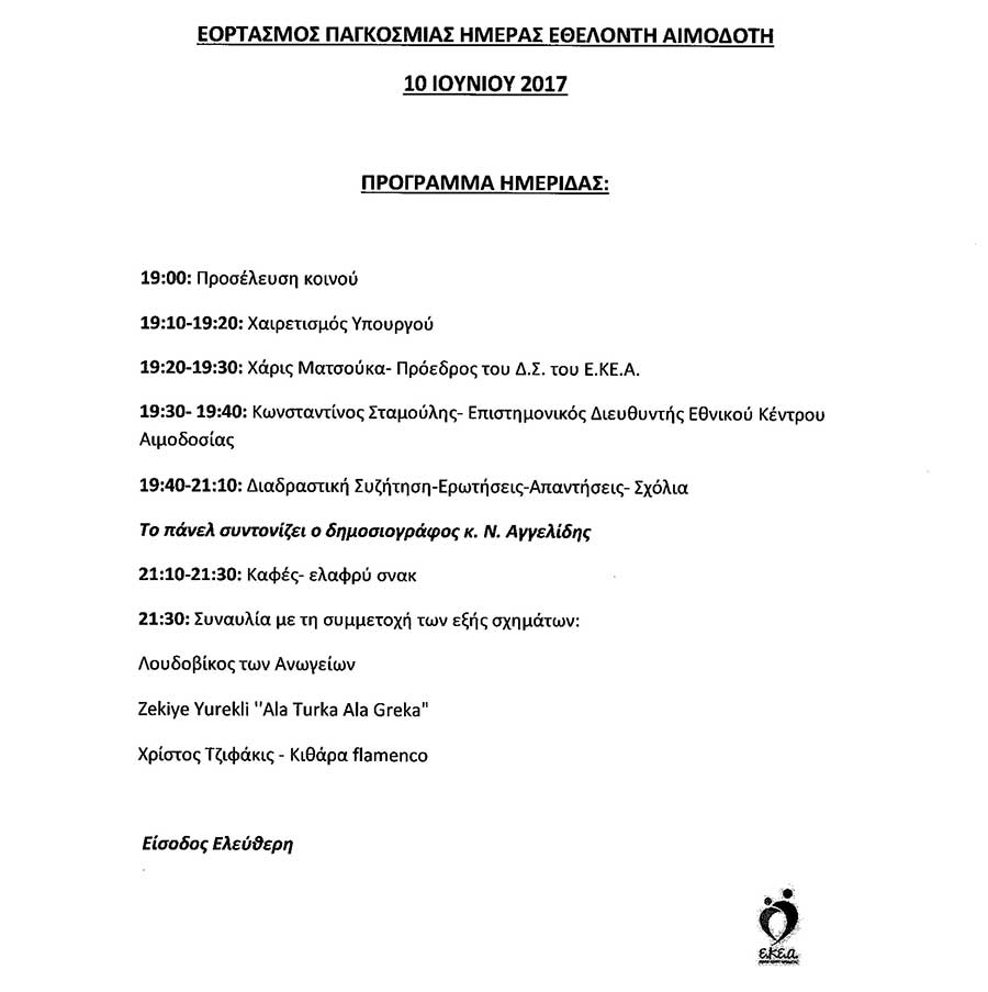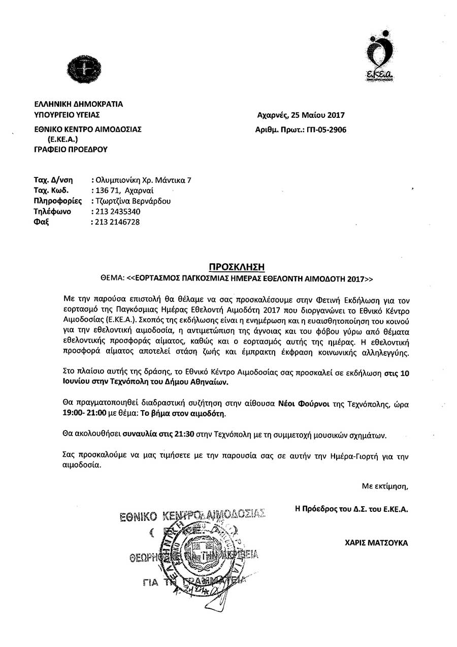 Παρακάτω πατήστε τους συνδέσμους εικόνας και διαβάστε για την πρόσκληση και το πρόγραμμα του Εορτασμού της παγκόσμιας ημέρας Εθελοντή Αιμοδότη 2017