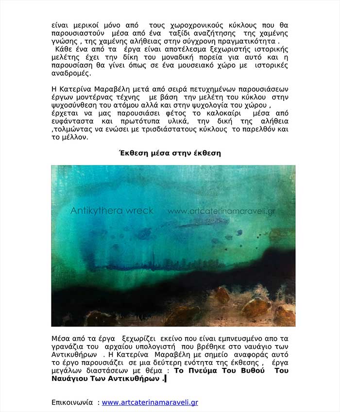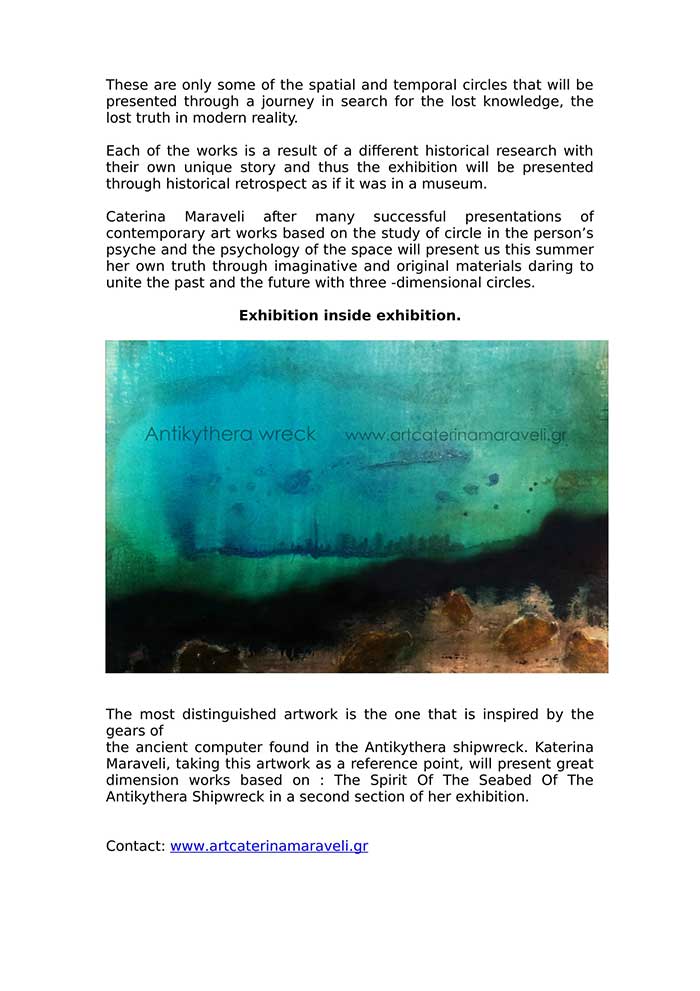 Κύκλοι μέσα από την Αρχαία Ελλάδα, είναι ο τίτλος της έκθεσης που θα παρουσιάσει η Κατερίνα Μαραβέλη στην αίθουσα «Μελίνα Μερκούρη» στην Ύδρα, τα εγκαίνια της οποίας θα γίνουν τη Δευτέρα 26 Ιουνίου 2017 και ώρα 8μ.μ. Η έκθεση θα είναι ανοιχτή για το κοινό από τη Δευτέρα 26 Ιουνίου 2017 έως και το Σάββατο 2 Ιουλίου 2017 και ώρες: 11π.μ. έως 1μ.μ. και 7μ.μ. έως 11μ.μ. Κάθε έργο της Κατερίνας Μαραβέλη είναι αποτέλεσμα ξεχωριστής ιστορικής μελέτης έχει την δίκη του μοναδική πορεία… Η Κατερίνα Μαραβέλη μετά από σειρά πετυχημένων παρουσιάσεων έργων μοντέρνας τέχνης με βάση την μελέτη του κύκλου στην ψυχοσύνθεση του ατόμου αλλά και στην ψυχολογία του χώρου, έρχεται να μας παρουσιάσει φέτος το καλοκαίρι στην Ύδρα μέσα από ευφάνταστα και πρωτότυπα υλικά, την δική της αλήθεια, τολμώντας να ενώσει με τρισδιάστατους κύκλους το παρελθόν και το μέλλον, και όπως γράφει χαρακτηριστικά σε μέσο κοινωνικής δικτύωσης: «Το ταξίδι της γνώσης μέσα στον χωροχρόνο συνεχίζεται με επόμενη στάση την όμορφη Ύδρα...». http://hydraspoliteia.blogspot.gr/2017/06/blog-post_11.html?spref=fb
