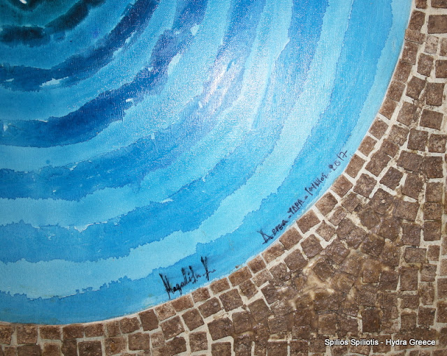 Ο πίνακας απεικονίζει την Ύδρα μέσα από το σύμπαν, μέσα από το υγρό στοιχειό, μέσα από την γη αλλά και μέσα από τους ανθρώπους της είναι ένα σπιράλ αντιθέσεων αλλά και αρμονίας που ενώνει το παρόν με το μέλλον την γη με τον ουρανό την λογική με την καρδιά. Έτσι όλοι οι επισκέπτες που πήραν μέρος στο διαδραστικό εικαστικό έργο, τοποθέτησαν ψηφίδες που μοιάζουν με τα θραύσματα τον αρχαίων αγγείων που βρίσκονται στον βυθό γύρω από το νησί…