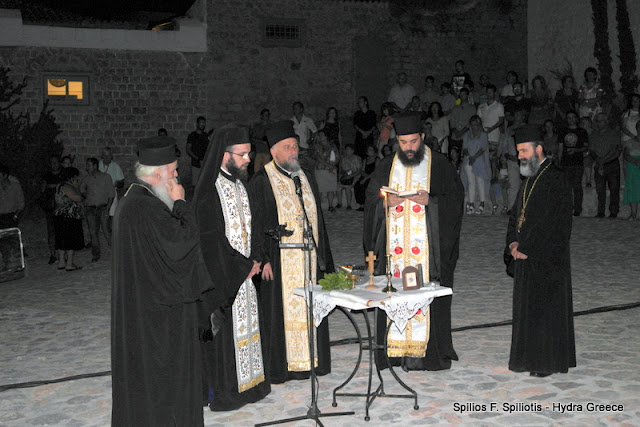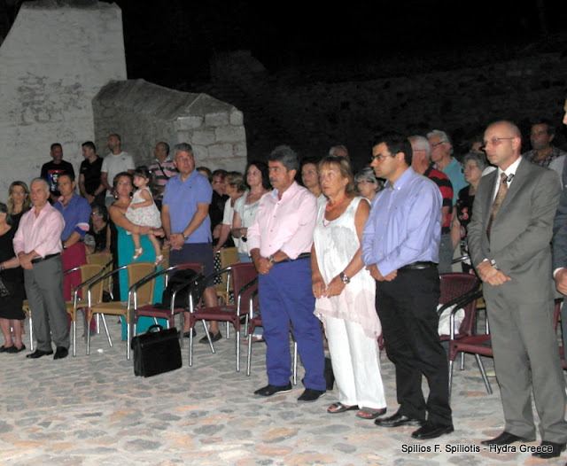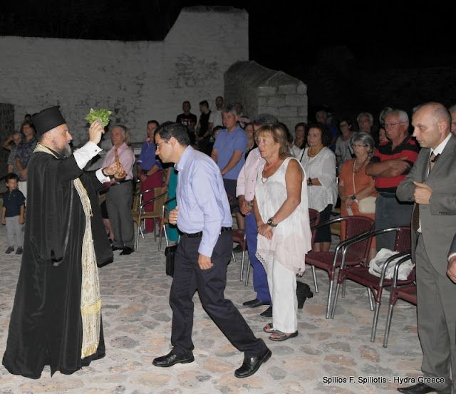 Μετά το πέρας του Αγιασμού ο  Πρωτοπρεσβύτερος π. Ακίνδυνος Δαρδανός, Γενικός Αρχιερατικός Επίτροπος, σε σύντομη χαιρετισμό του αναφέρθηκε στη χρησιμότητα του υπαίθριου χώρου πολιτιστικών εκδηλώσεων και κατέληξε ευχαριστώντας όλους όσους βοήθησαν το νησί μας. Ο Δήμαρχος Ύδρας κ. Γ. Κουκουδάκης αναφέρθηκε στην ολοκλήρωση του έργου του χώρου πολιτιστικών εκδηλώσεων (θεατράκι), και εξήγγειλε δύο ακόμη έργα για τα Καμίνια, τον χώρο για την παιδική χαρά αλλά και το λιμάνι της περιοχής. Επίσης αναφέρθηκε σε έργα που βρίσκονται σε εξέλιξη στην Ύδρα και άλλα που πρόκειται να γίνουν και ευχαρίστησε την Περιφέρεια Αττικής και όλους όσους βοήθησαν την Ύδρα, κυβέρνηση, χορηγούς, δημοτικούς συμβούλους κ.α.