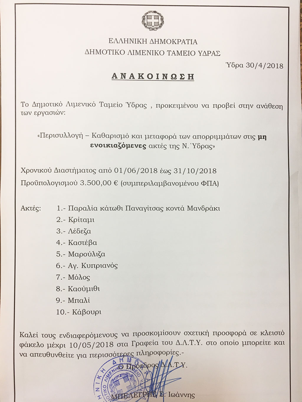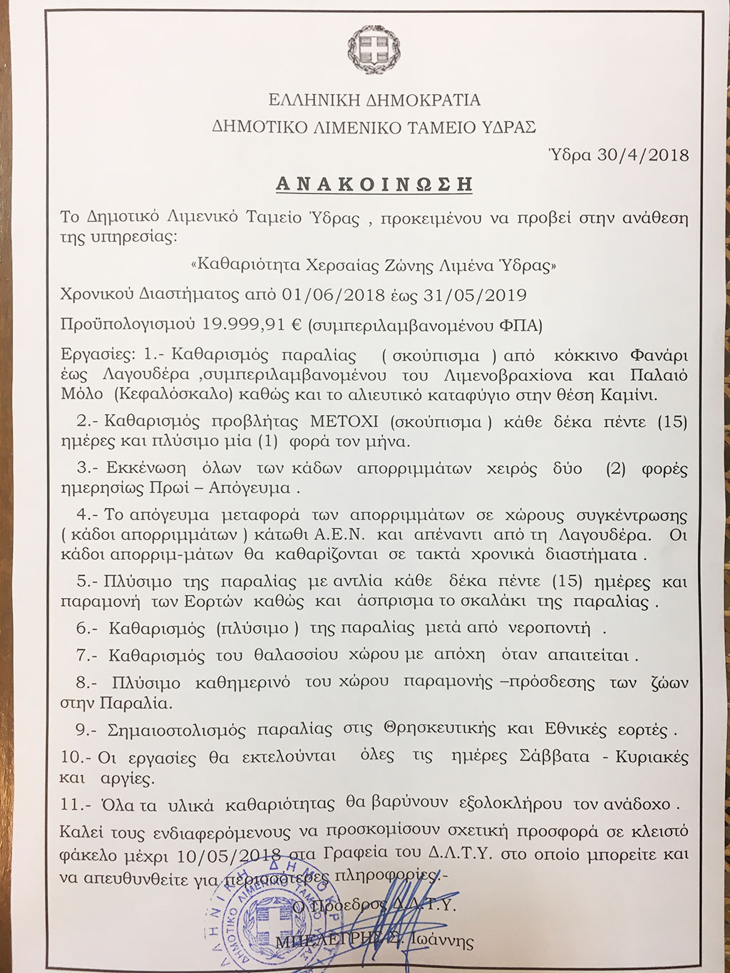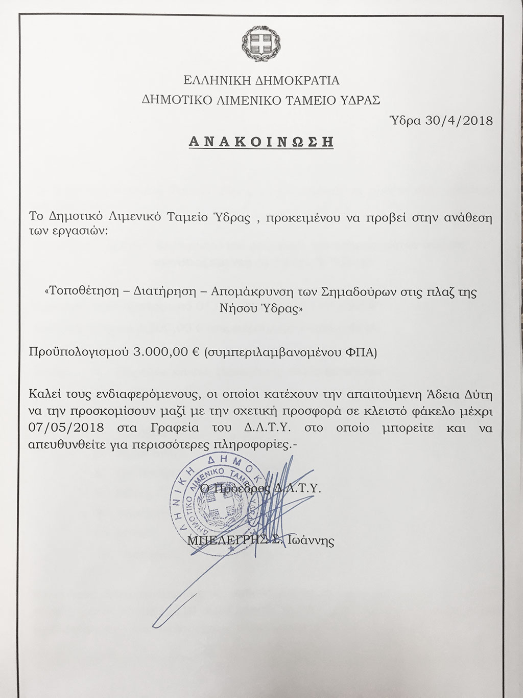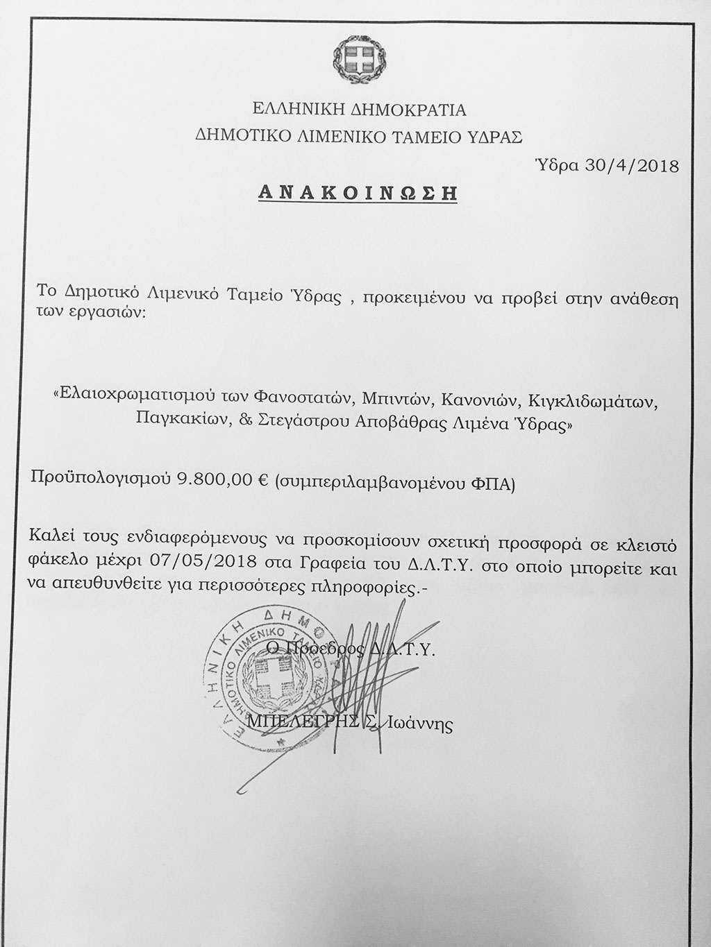Ανάθεση εργασιών από το Δημοτικό Λιμενικό Ταμείο Υδρας, για "Ελαιοχρωματισμού των Φανοστατών, Μπιντών, Κανονιών, Κιγκλιδωμάτων, Παγκακιών και Στεγάστρου Αποβάθρας Λιμένα Ύδρας" (30/04/2018) |