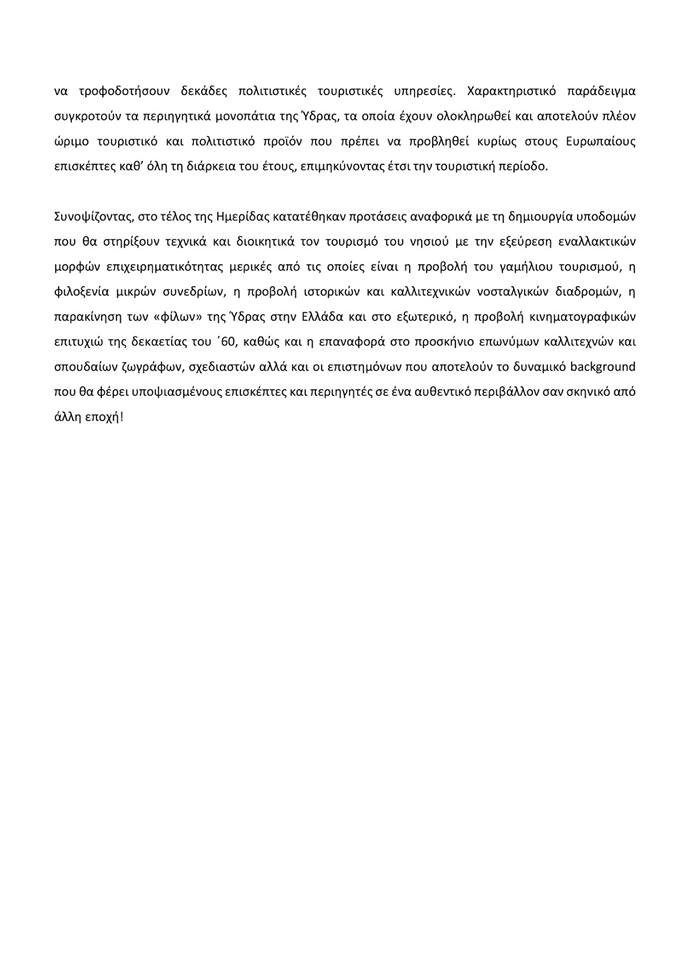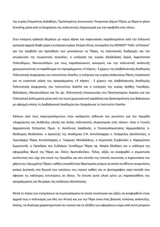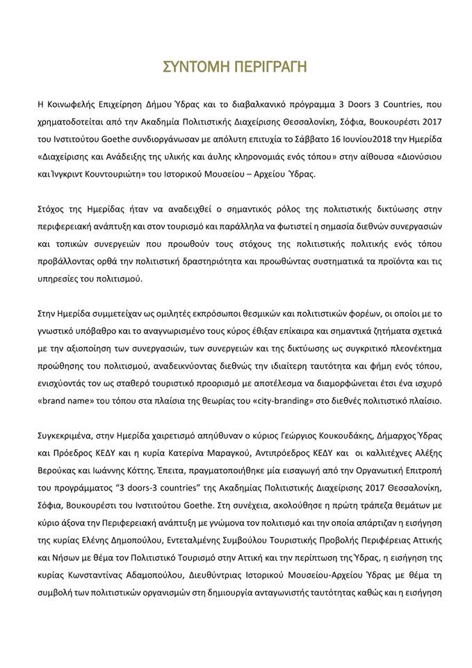 To Δελτίο Τύπου λήξης της Ημερίδας Διαχείρισης και Ανάδειξης Υλικής και Άυλης Πολιτιστικής Κληρονομιάς ενός τόπου που πραγματοποιήθηκε στις 16/06/2018 στο Ιστορικό Μουσείο Ύδρας. Μπορείτε να το διαβάσετε από τις παρακάτω φωτογραφίες.