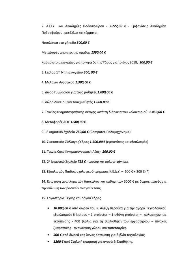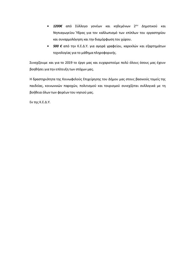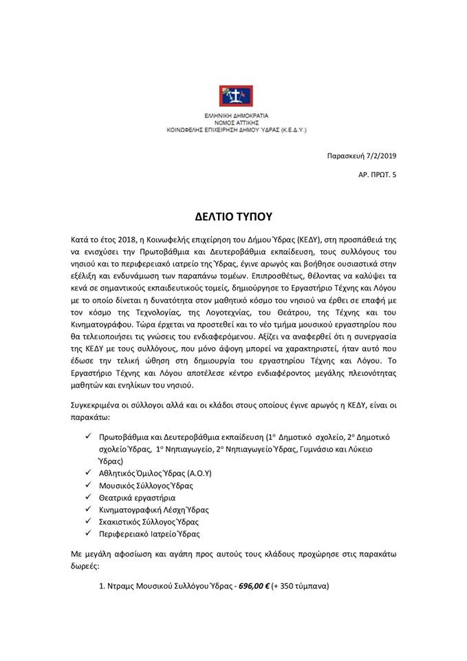 Η Κοινοφελής Επιχείρηση του Δήμου Ύδρας αρωγός σε Εκπαίδευση και Συλλόγους (07/02/2019)