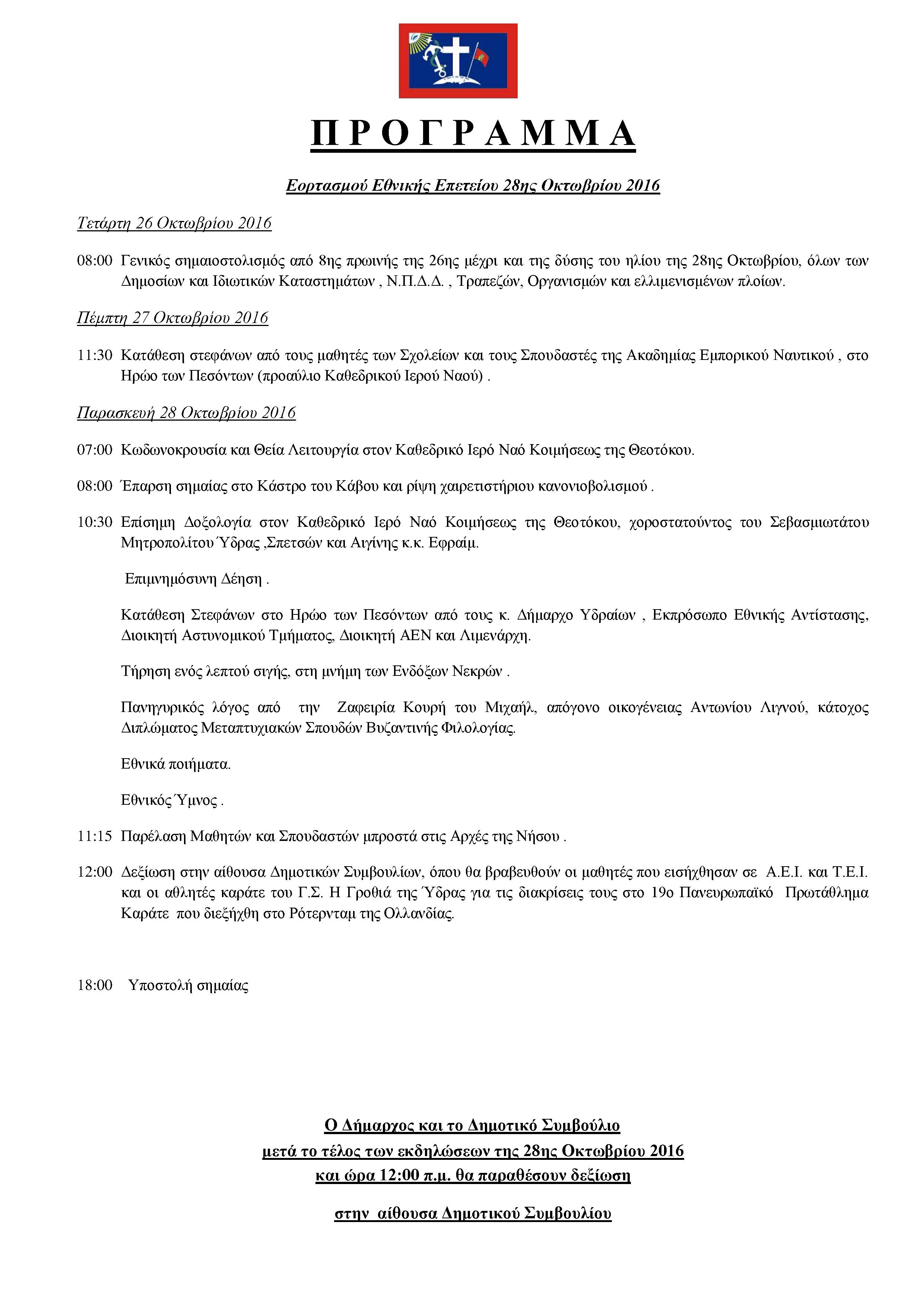 Τετάρτη 26 Οκτωβρίου 2016 08:00 Γενικός σημαιοστολισμός από 8ης πρωινής μέχρι και της δύσης του ηλίου της 28ης Οκτωβρίου, όλων των Δημοσίων και Ιδιωτικών Καταστημάτων Ν.Π.Δ.Δ. ,Τραπεζών , Οργανισμών και ελλιμενισμένων πλοίων. Πέμπτη 27 Οκτωβρίου 2016 11:30 Κατάθεση στεφάνων από τους μαθητές των Σχολείων και τους σπουδαστές της Ακαδημίας Εμπορικού Ναυτικού, στο Ηρώο των Πεσόντων (προαύλιο Καθεδρικού Ιερού Ναού). Παρασκευή 28 Οκτωβρίου 2016 07:00 Κωδωνοκρουσία και Θεία Λειτουργία στον Καθεδρικό Ιερό Ναό. 08:00 Έπαρση σημαίας στο Κάστρο του Κάβου και ρίψη χαιρετιστήριου κανονιοβολισμού 10:30 Επίσημη Δοξολογία στον Καθεδρικό Ιερό Ναό Κοιμήσεως της Θεοτόκου, χοροστατούντος του Σεβ. Μητροπολίτου Ύδρας, Σπετσών και Αιγίνης κ.κ. Εφραίμ. Στη συνέχεια θα ακολουθήσουν στο προαύλιο του Ι. Καθεδρικού Ιερού Ναού: