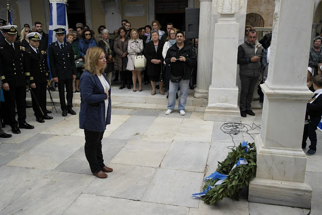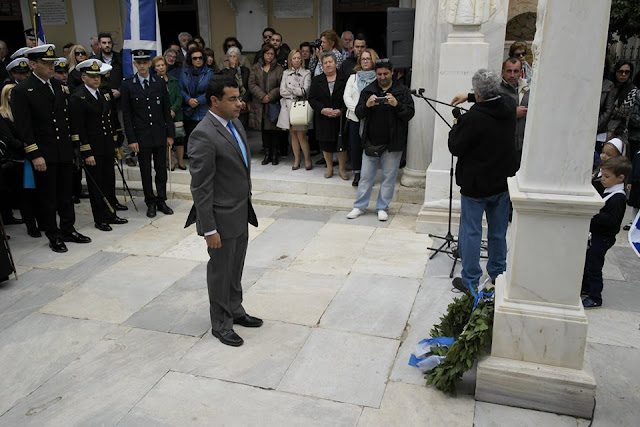 Μετά το πέρας της παρέλασης στην αίθουσα Συνεδριάσεων του Δημοτικού Συμβουλίου, παρουσία του Σεβασμιότατου Μητροπολίτου Ύδρας, Σπετσών και Αιγίνης κ.κ. Εφραίμ που τον συνόδευε ο Ιερολογιώτατος Διάκονος π. Νεκτάριος Δαρδανός, των Αστυνομικών και Λιμενικών Αρχών του νησιού και πολυπληθούς ακροατηρίου, ο Δήμαρχος Ύδρας κ. Γ. Κουκουδάκης αναφέρθηκε στην επέτειο του «ΟΧΙ», την κρίση που μαστίζει την χώρα, όπως και την κρίση στις ανθρώπινες σχέσεις όπως χαρακτηριστικά είπε και υπογράμμισε ότι θα πρέπει να υπερασπιστούμε την συνοχή και την ενότητα της πατρίδας μας τονίζοντας ότι αυτό επιτυγχάνεται μέσω της παιδείας. Κλείνοντας την ομιλία του συνεχάρη κ. Ζαφειρία Κουρή του Μιχαήλ απόγονο της οικογένειας του Αντωνίου Λιγνού για τον επετειακό της λόγο, τους μαθητές και τους σπουδαστές αλλά και τους εκπαιδευτικούς για την συμμετοχή τους στις εορταστικές εκδηλώσεις και την παρέλαση και κατέληξε την ομιλία του ευχόμενος χρόνια πολλά.