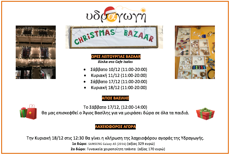 Ελάτε όλοι να δείτε τις δημιουργίες των παιδιών, να διαλέξετε πρωτότυπα δώρα για τα Χριστούγεννα (ημερολόγια, τσάντες, καπέλα, κοσμήματα, σκαμνάκια, σαγιονάρες, μπρελόκ, βιβλία, ποδιές, κούπες, γούρια για το νέο έτος) και να υποστηρίξετε την Υδραγωγή που βοηθάει τα παιδιά της Ύδρας. ![]() |
