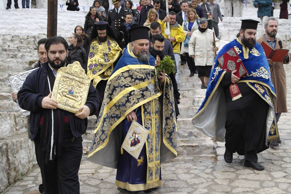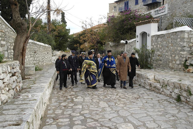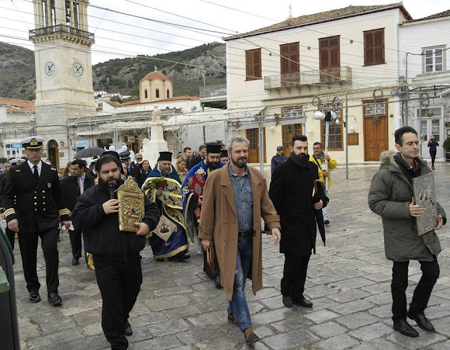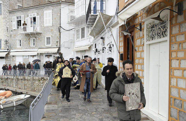 Μετά την τέλεση της Θείας Λειτουργίας και του Μεγάλου Αγιασμού σχηματίσθηκε λιτανευτική πομπή με προορισμό την συνοικία «Καλά-Πηγάδια» όπου κατά παράδοση γίνετε η Τελετή Αγιασμού και αγιάζονται τα νερά στα πηγάδια της όμορφης συνοικίας του νησιού μας. Μετά την τελετή Αγιασμού στα «Καλά Πηγάδια», η λιτανευτική πομπή κατευθύνθηκε στο λιμάνι της Ύδρας που κατέληξε στο μεγάλο λιμενοβραχίονα και εκεί τελέστηκε ο Αγιασμός των υδάτων με την κατάδυση του Τιμίου Σταυρού στη θάλασσα.