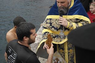 Όπως επιτάσσει το έθιμο, νέα παιδιά από την Ύδρα βούτηξαν στα παγωμένα νερά του λιμανιού για να ανασύρουν τον Τίμιο Σταυρό και να πάρουν την ευλογία Του.